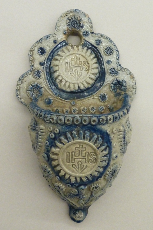 Wijwaterbakje met tweemaal IHS, vogel, twee engelenkopjes en blad- en bloemmotieven