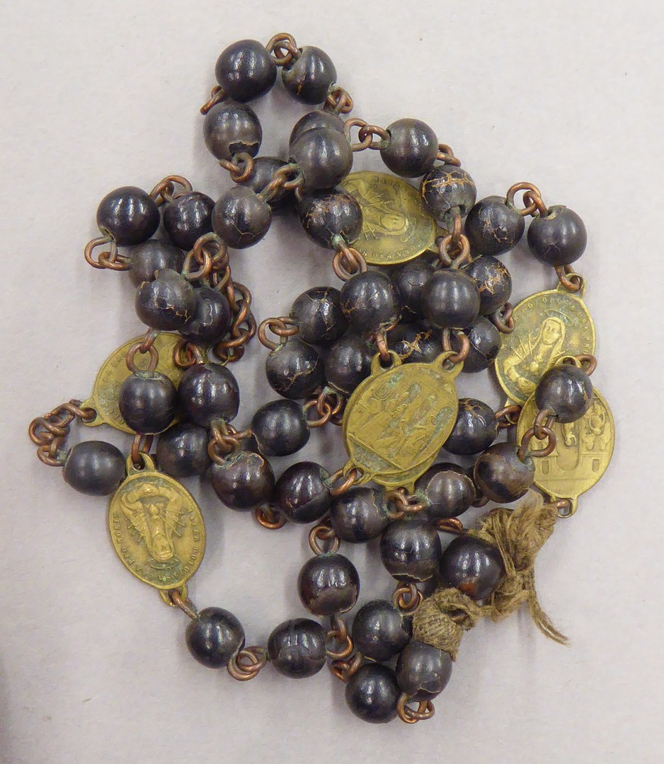 Rozenkrans zonder staart, zeven maal zeven gladde, zwarte, houten kralen met telkens tussen de zeven kralen een ovale, koperen medaille met aan de voorzijde een voorstelling van Maria met zeven zwaarden in haar hart. Opschrift: Mater dolorosa ora pro nobis. Op de keerzijde een van de zeven smarten: 1. Vlucht naar Egypte, 2. Opdracht in ...