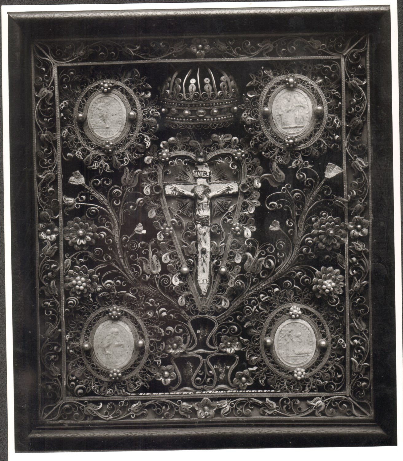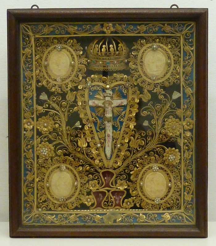 Reliekkast met bloemen en ornamentwerk met in het centrum een crucifix