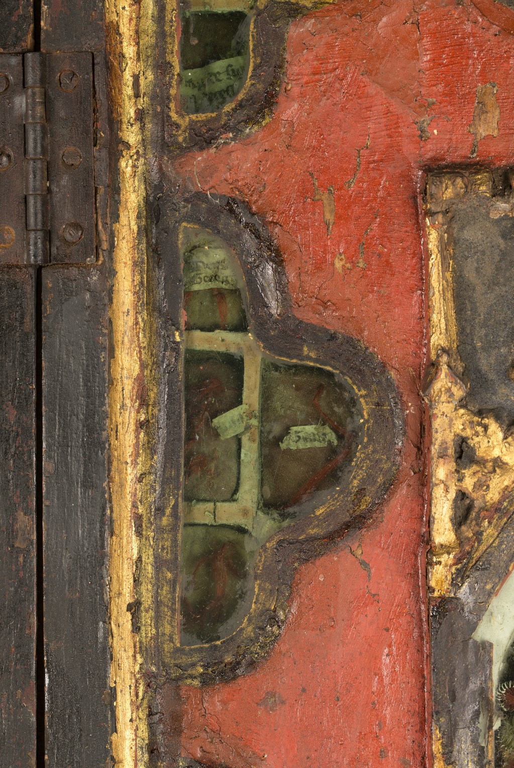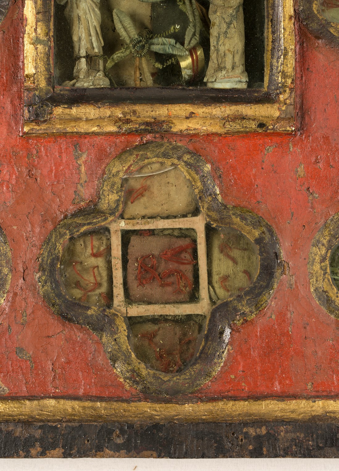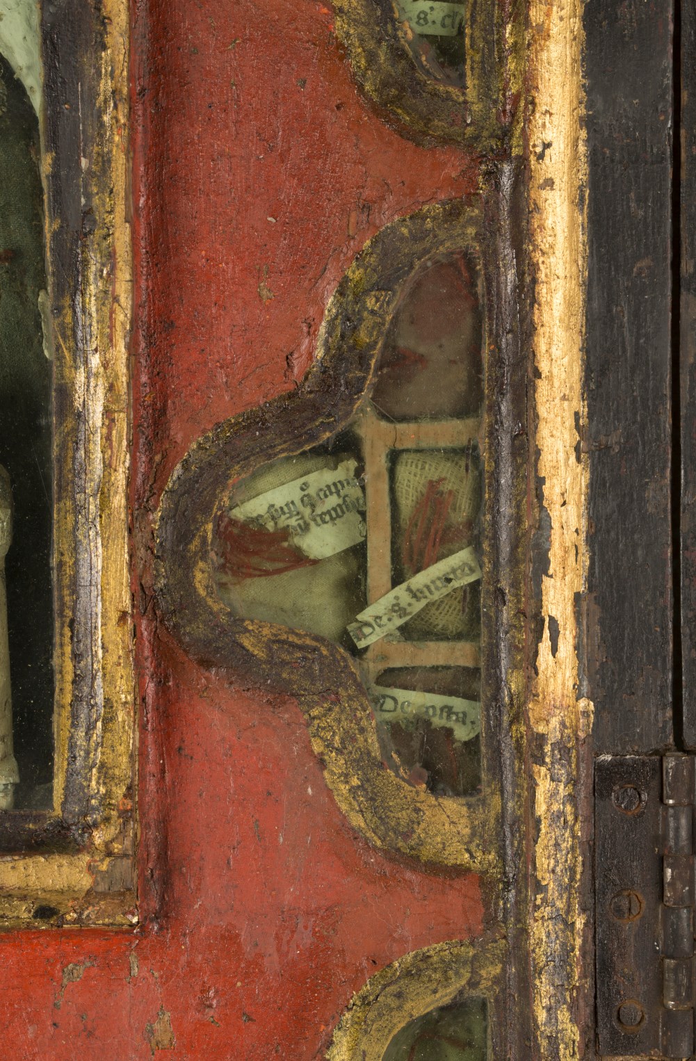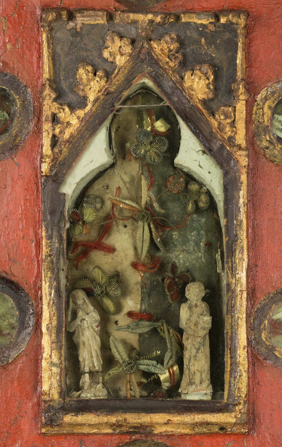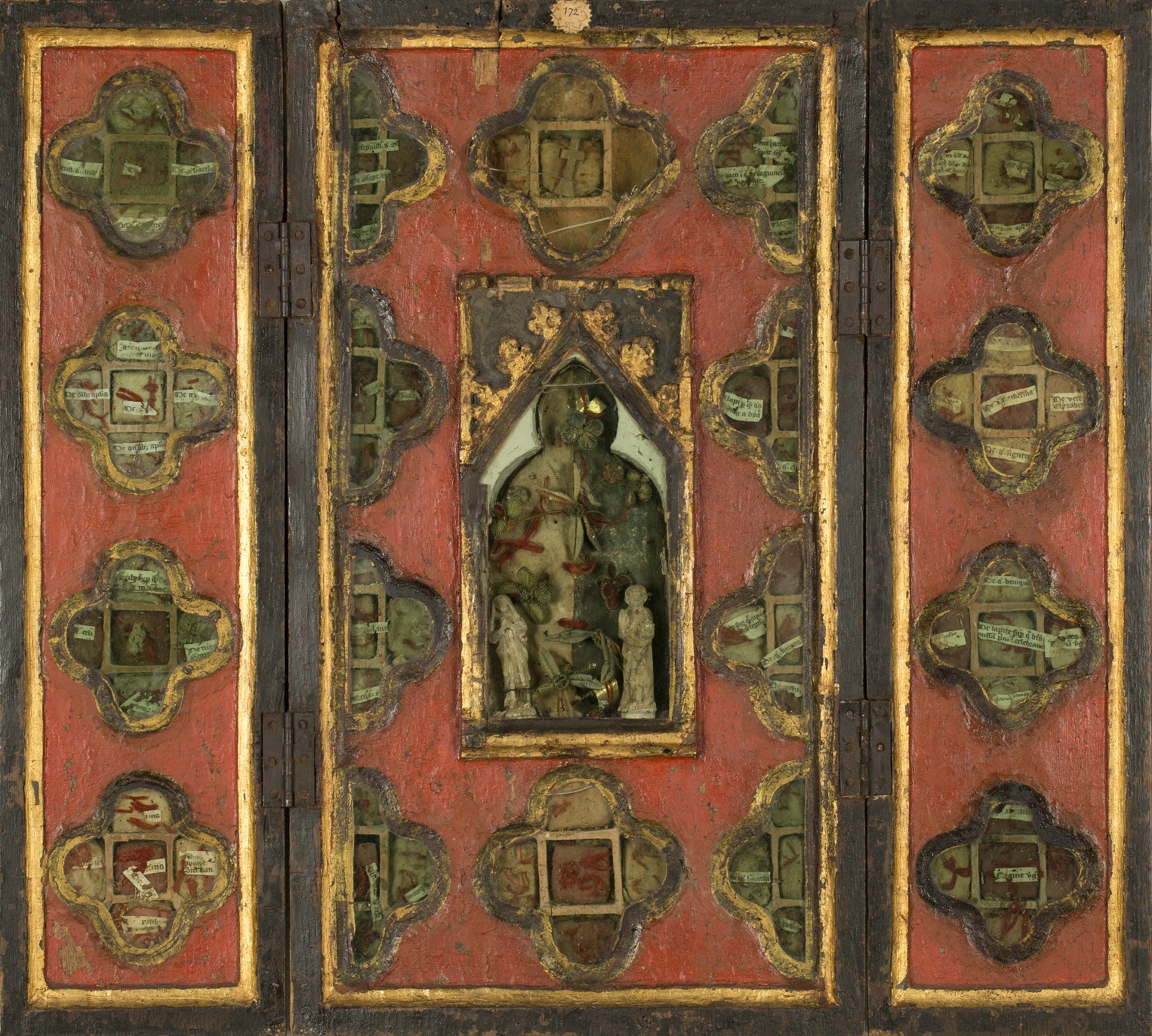 Reliekkast in de vorm van een drieluik met beeldjes Maria en Johannes