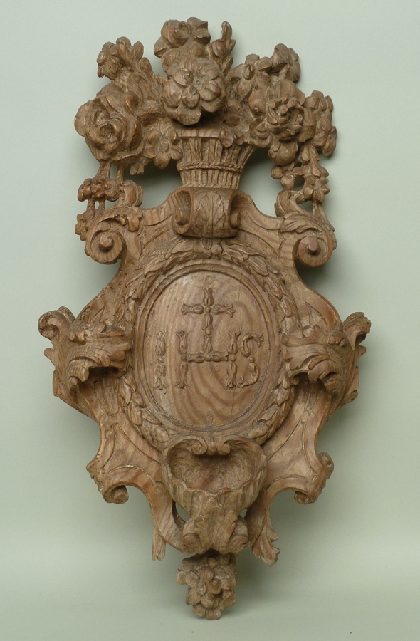 Wijwaterbakje met acanthusbladeren met ovaalvormig centrum waarin "IHS"