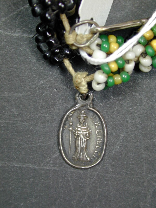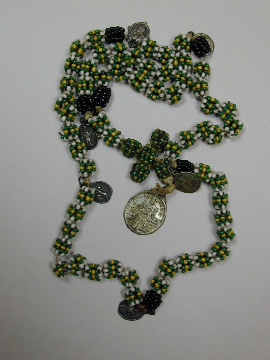 Rozenkrans met wit-geel-groene en donkere kralen, 8 medailles, o.a. O.L.V. van Hal en van Kevelaer