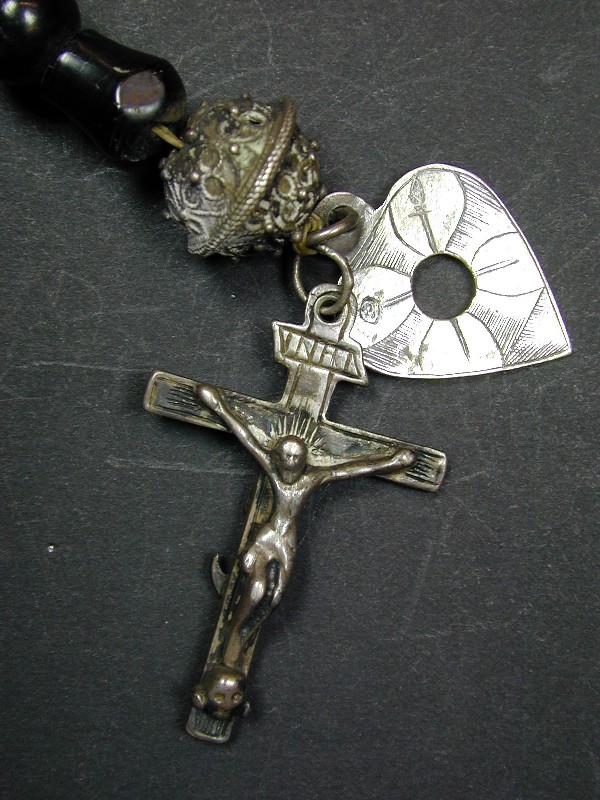 Rozenkrans met kralen van git en zilver, met vijf medailles en kruisje van zilver