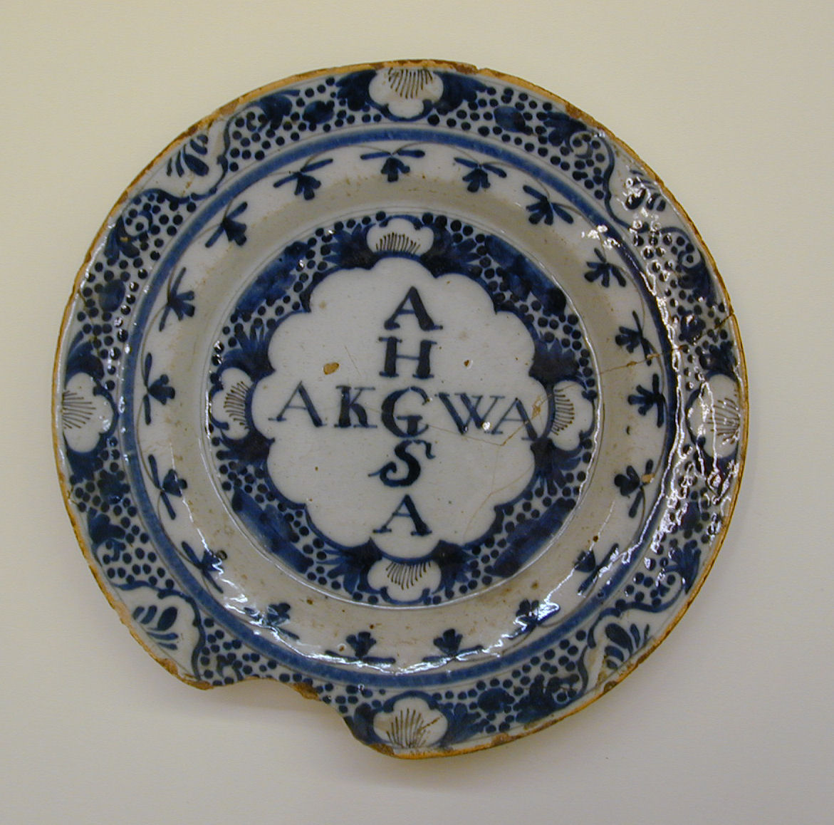 Faience bord met "God hoort alles, God weet alles, God siet alles, God kent alles", alleen beginletters