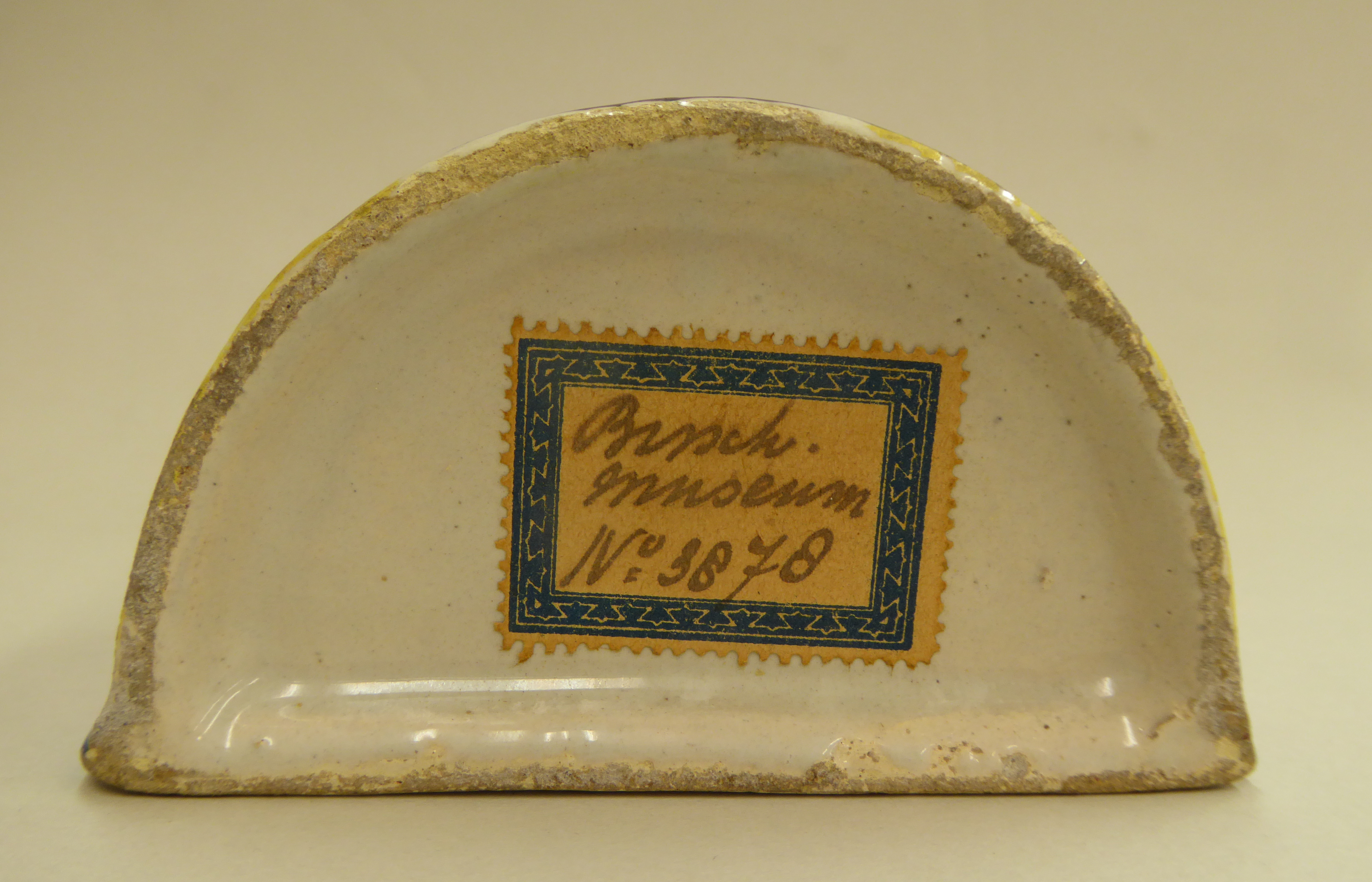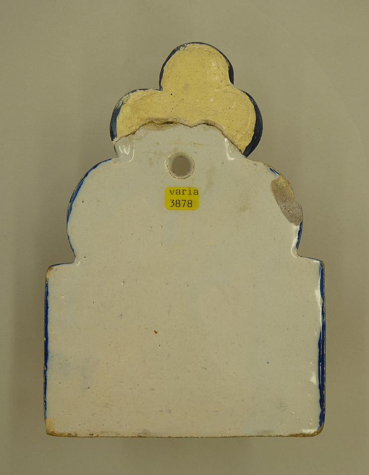 Wijwaterbakje waarop gekruisigde Christus en ornamenten in geel, blauw en bruin