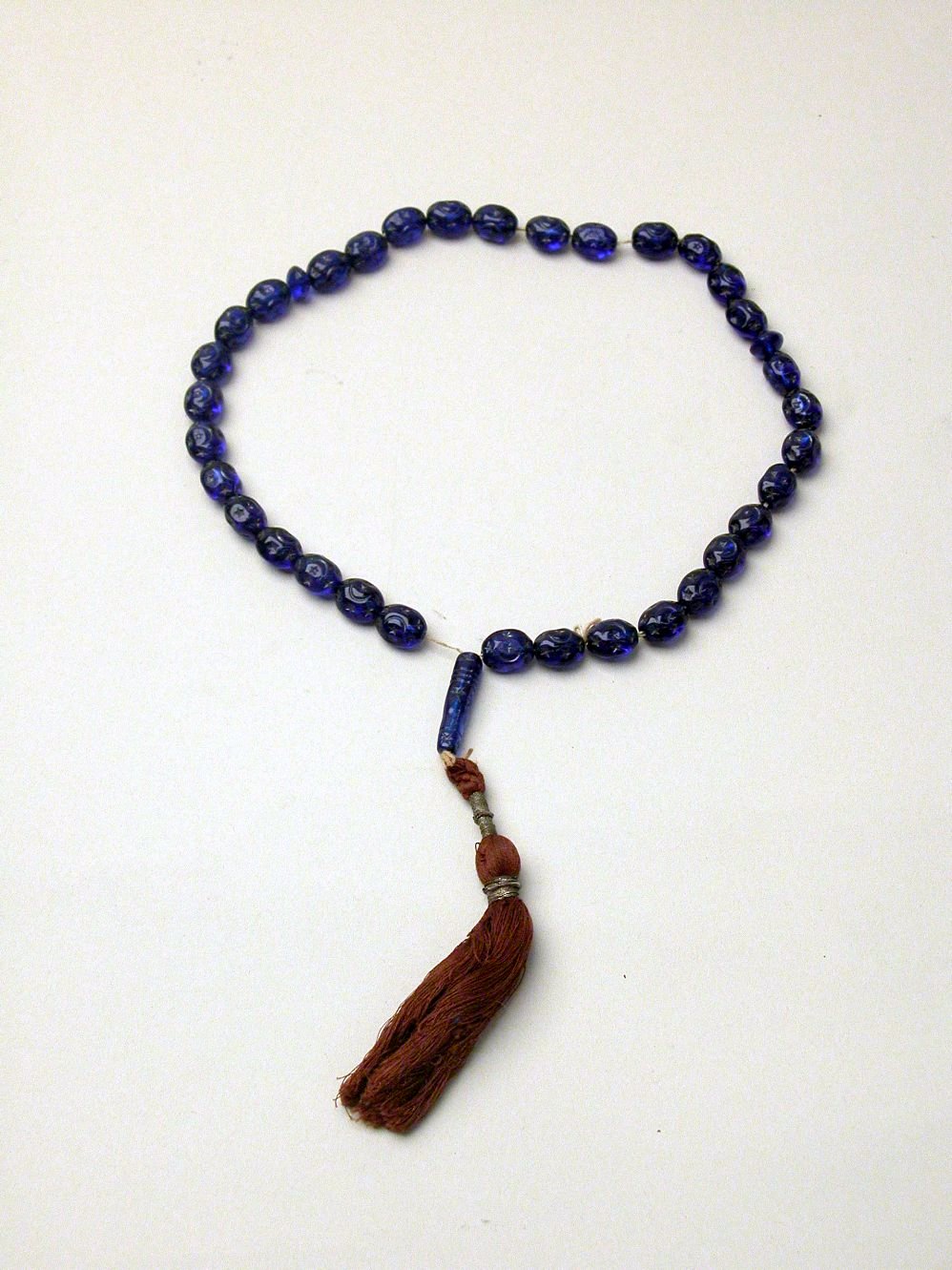 Turks bidsnoer van blauw glas, versierd met ster en halve maan, aan uiteinde bruine franje