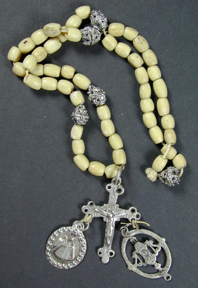 Rozenkrans van zilver en been, met zilveren kruisje en twee medaillons