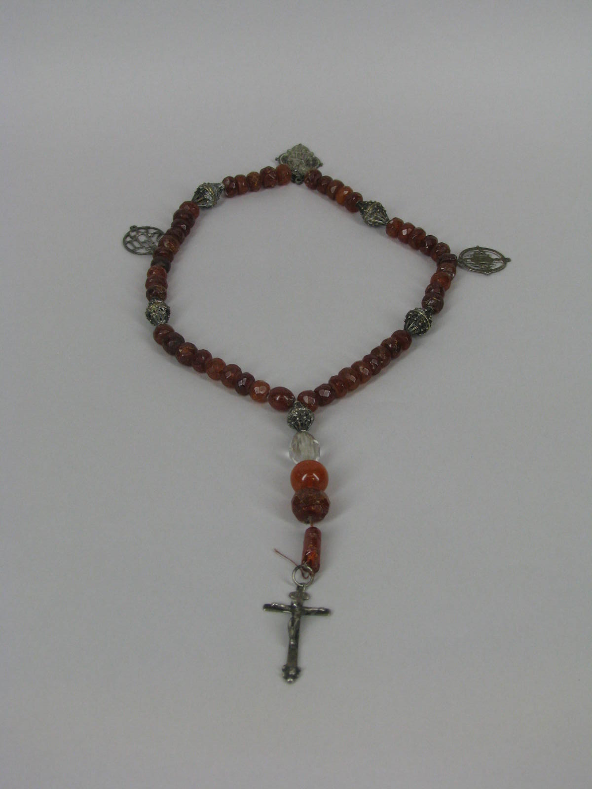 Rozenkrans van barnsteen met zilveren Onze Vaders, kruisje en drie hangers