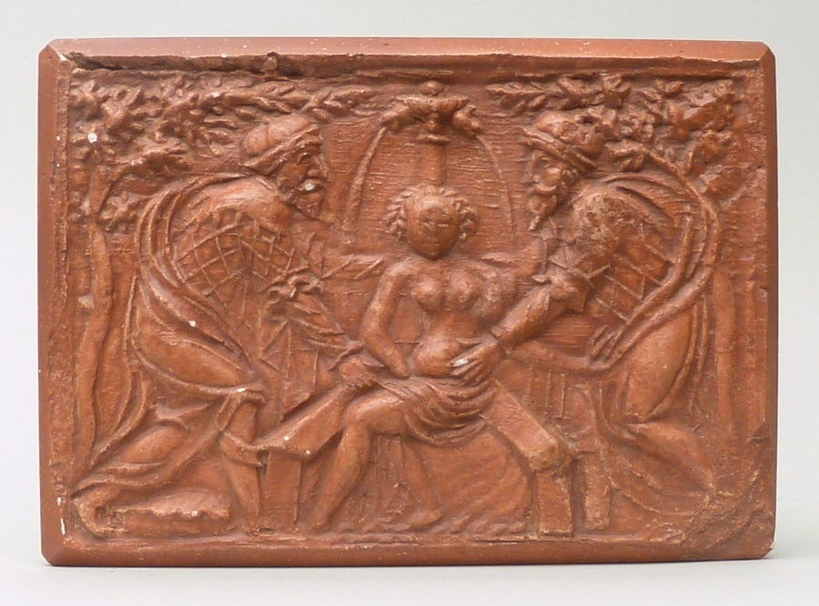 Afgietsel van haardsteen met Suzanna benaderd door de ouderlingen
