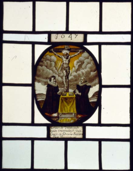 Glas met Adriaen de Visser, bode universiteit te Leuven met zijn vrouw Adriana Bouwens met crucifix