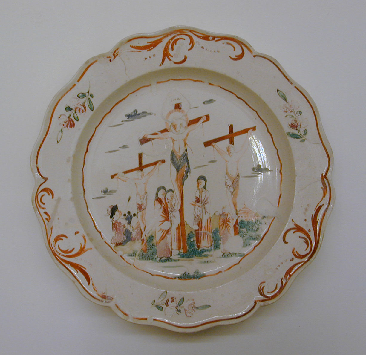 Bord met in kleuren geschilderde voorstelling van Calvarie
