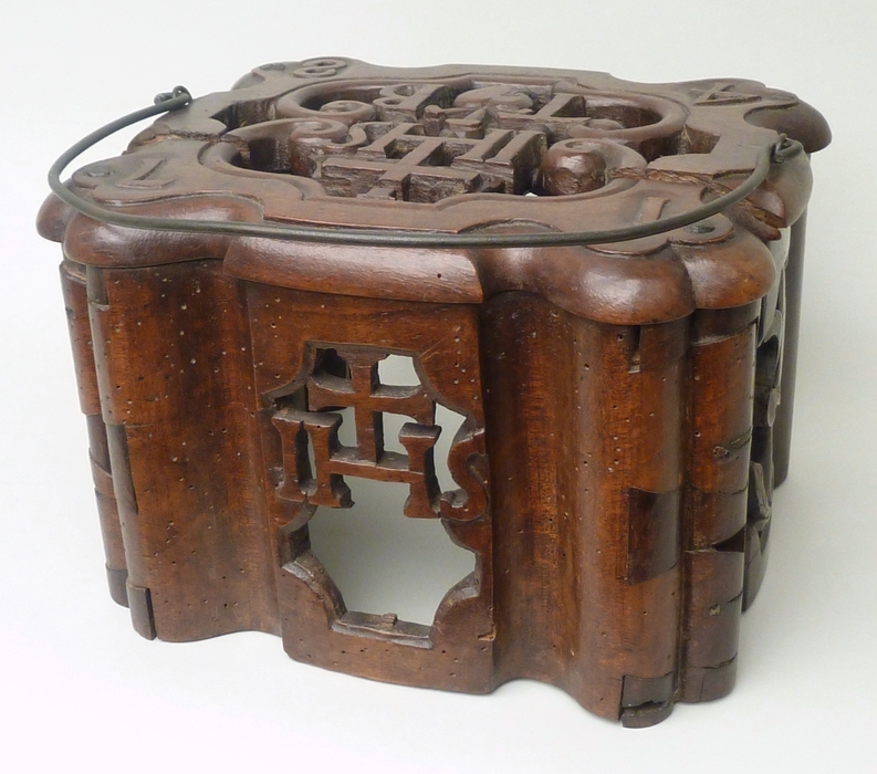 Stoof zonder bodem met houtsnijwerk met IHS, hart geflankeerd door "T" en "B"