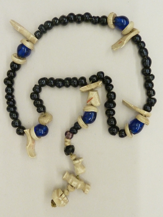 Rozenkrans van zwarte en blauwe kralen, met benen handjes en kruisje waaraan doodshoofdje