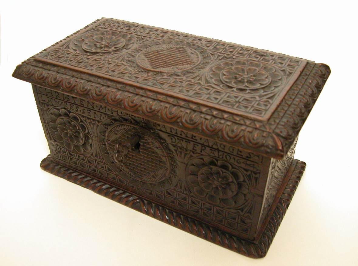 Kistje met snijwerk, Noorse huisvlijt(?), met "Christen M.H.K.B. Anne. Aagges. Lawressen dater ano 1644."