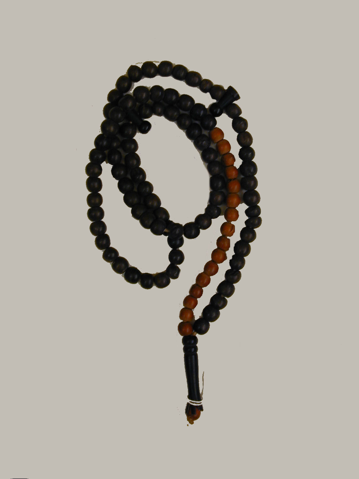 Rozenkrans of islamitisch gebedssnoer met donkere en lichte kralen en twee pionnen
