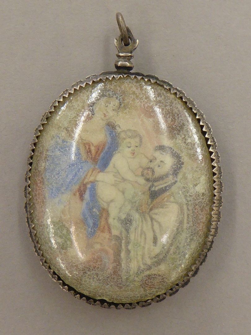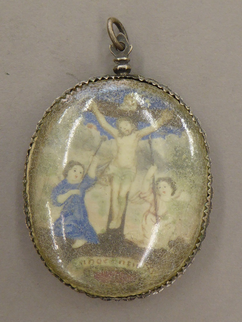 Ovale reliekhouder met tekening gekruisigde Christus, kz. Maria, met F. Xaverius