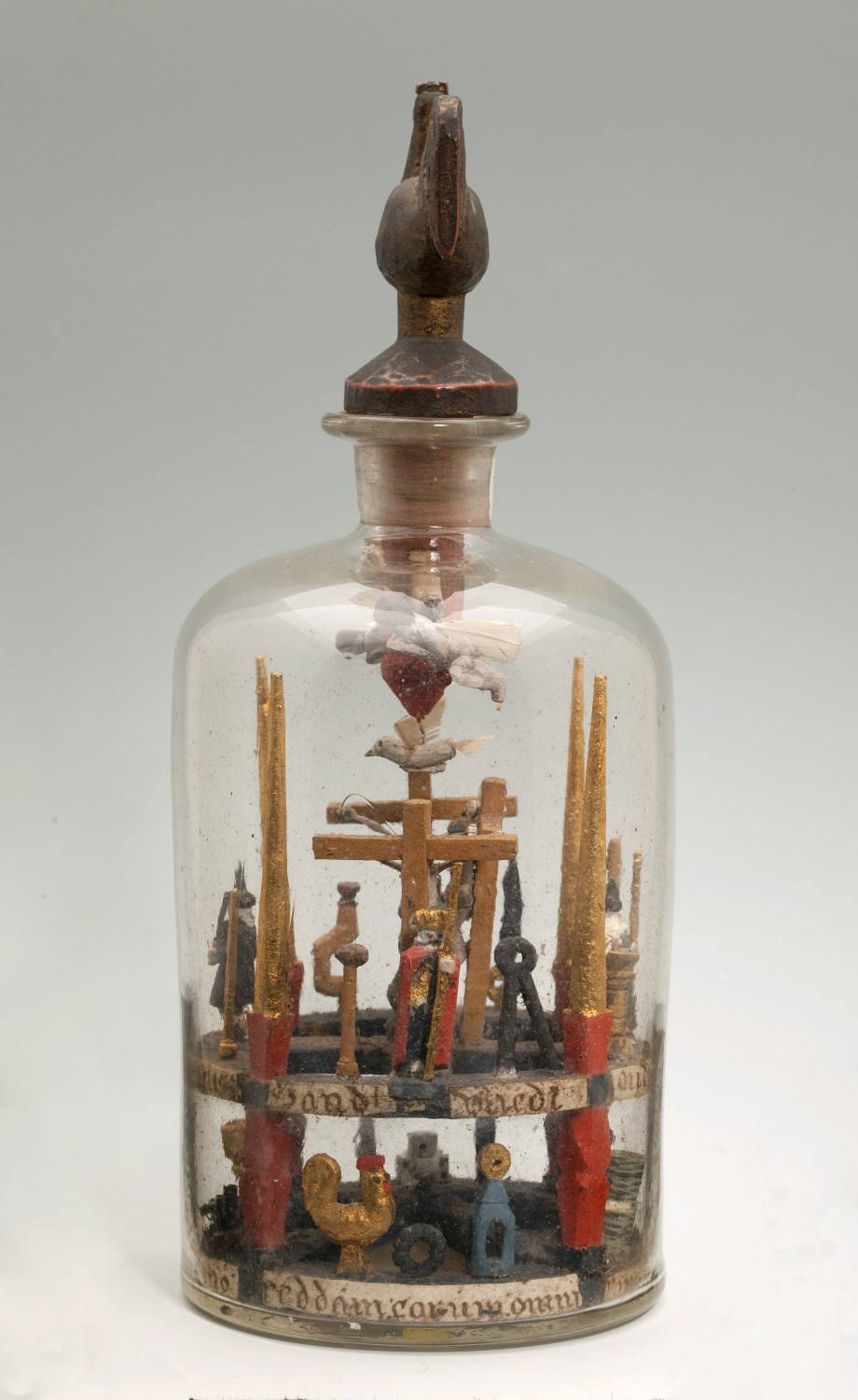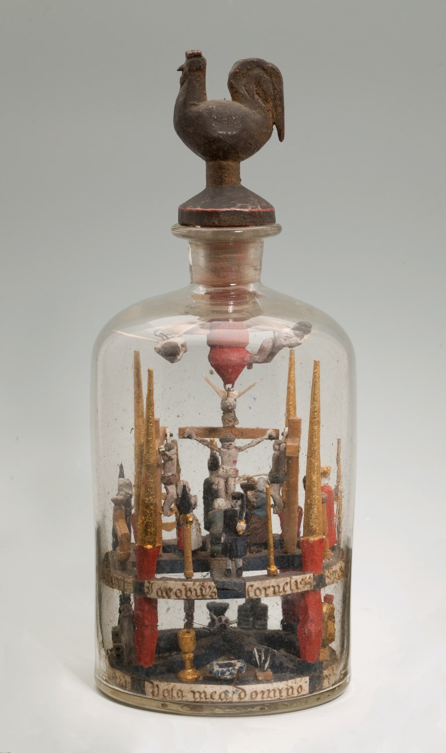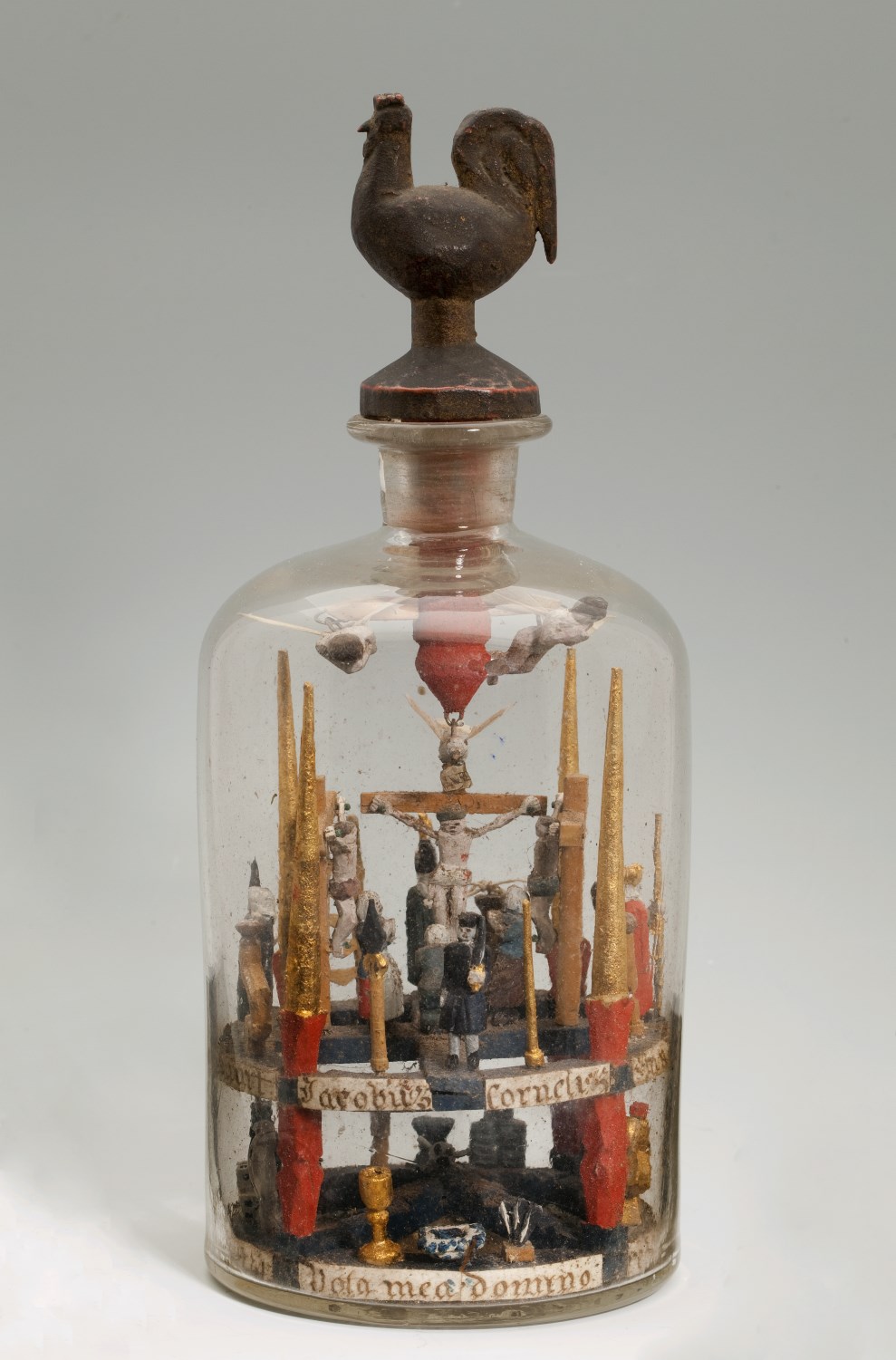 Geduldfles met gekruisigde Christus en lijdenswerktuigen in hout en papier, bekroond door een haan
