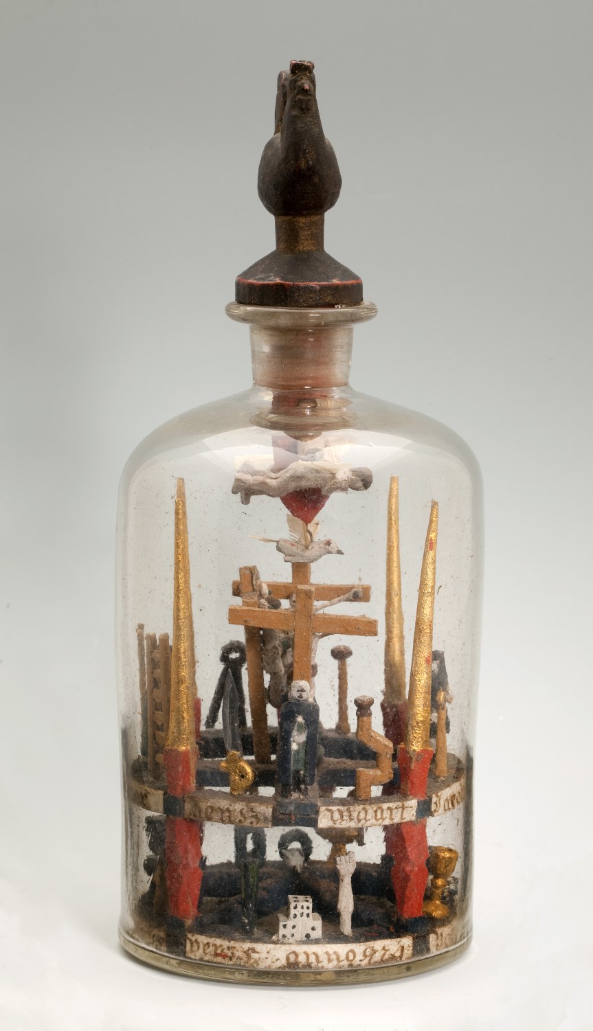 Geduldfles met gekruisigde Christus en lijdenswerktuigen in hout en papier, bekroond door een haan. De teksten in de fles luiden: Boven: “Jacobus Cornelisz Zandt […](?) 13 maart oud 19 jaar” Onder: “Vola mea domino reddam corum omnia populo cyus(?) ps 115 vers 5 anno 1774”