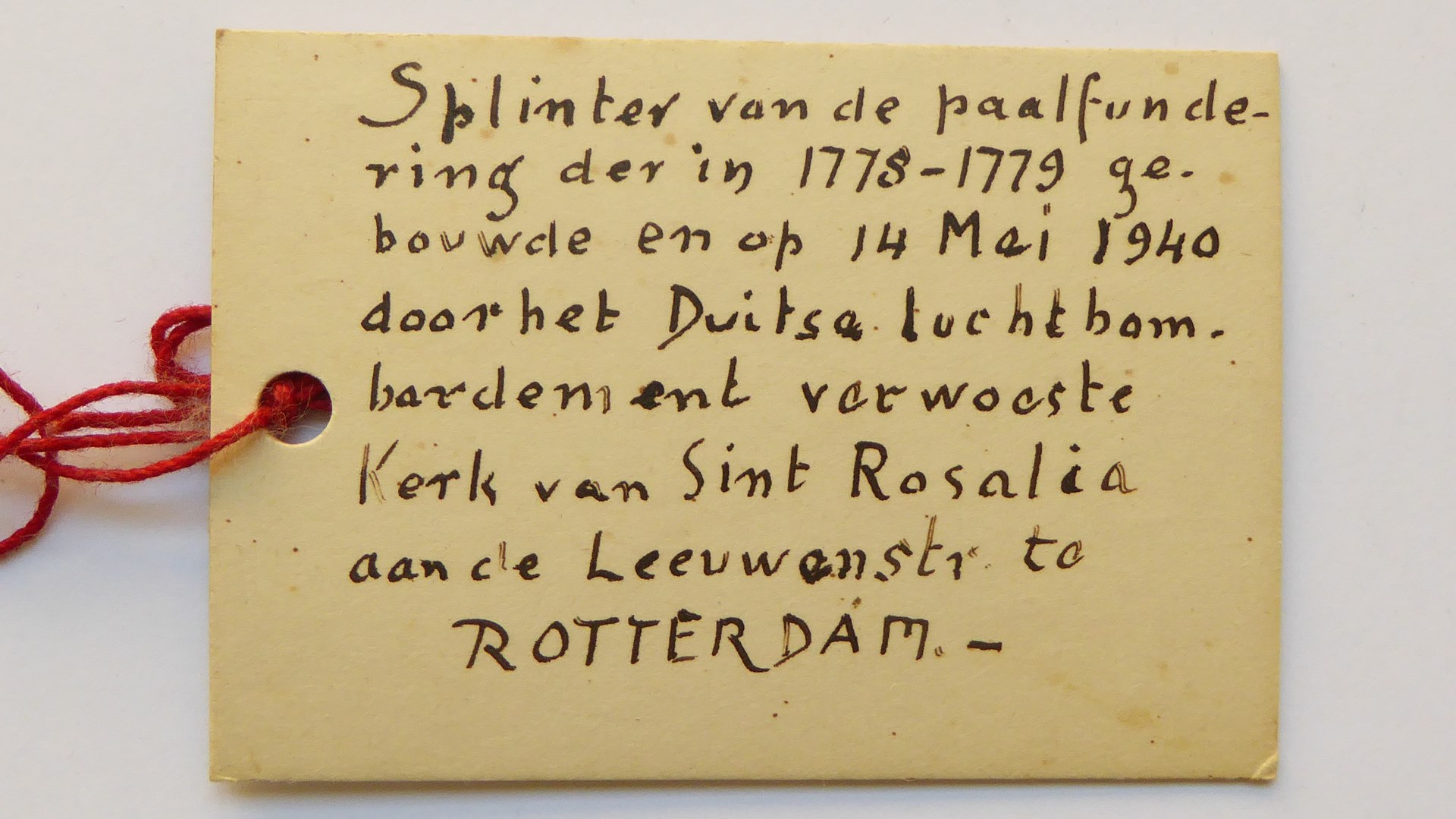 Splinter van paalfundering H. Rosalia kerk te Rotterdam, gebouwd 1778-1779, gebombardeerd 1940