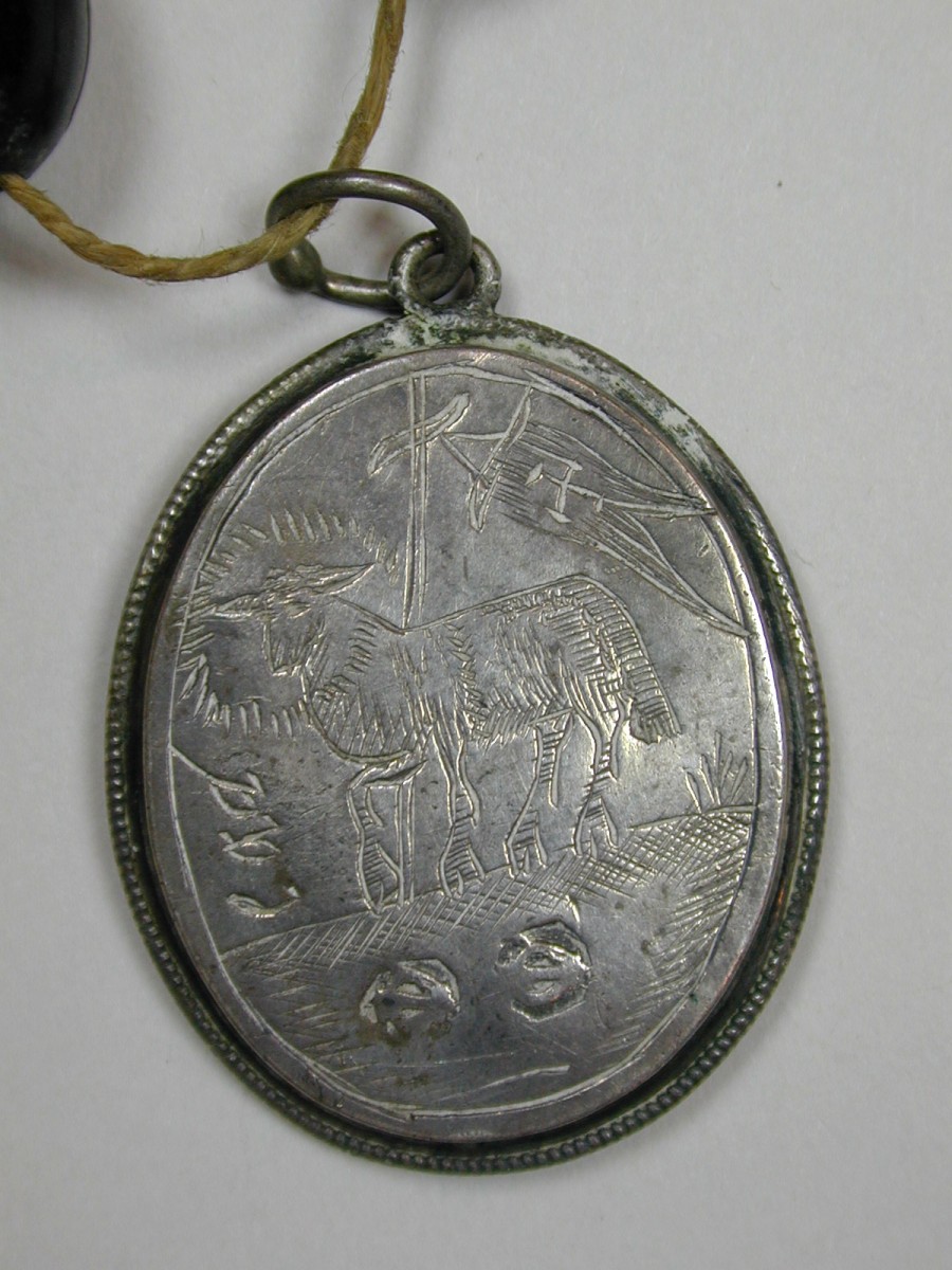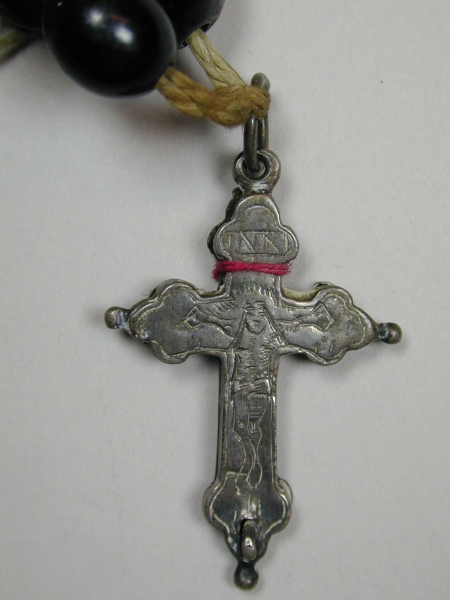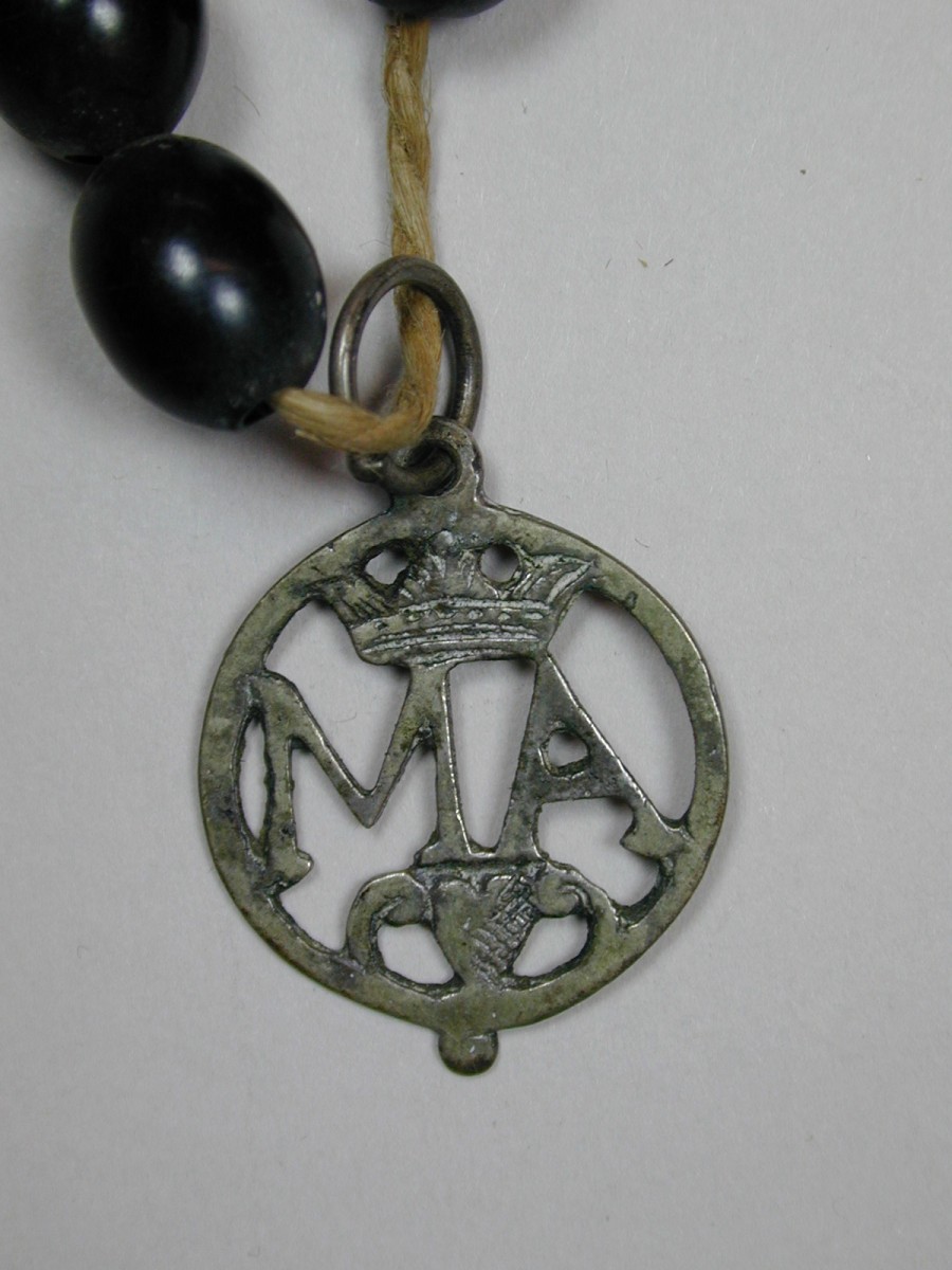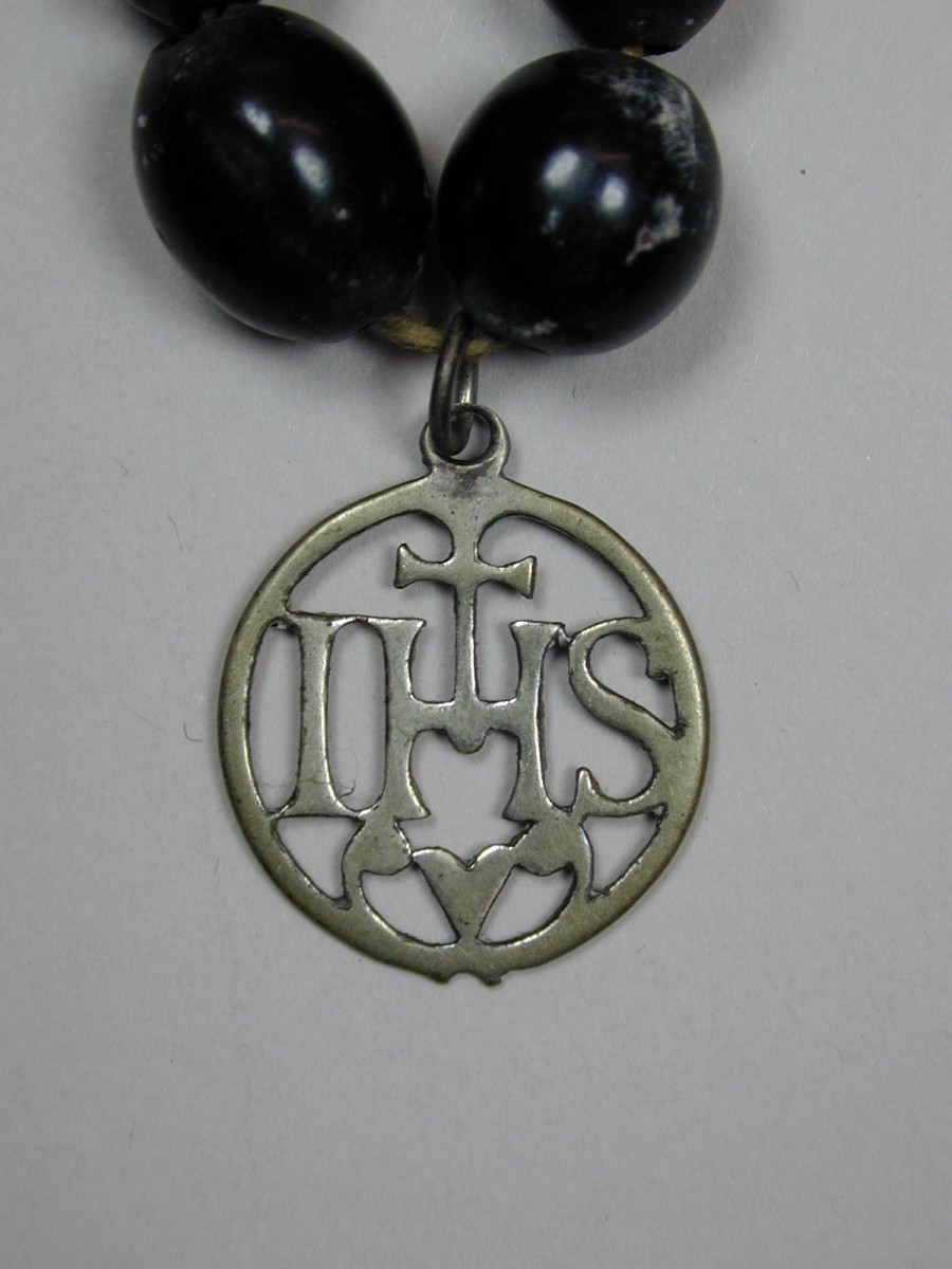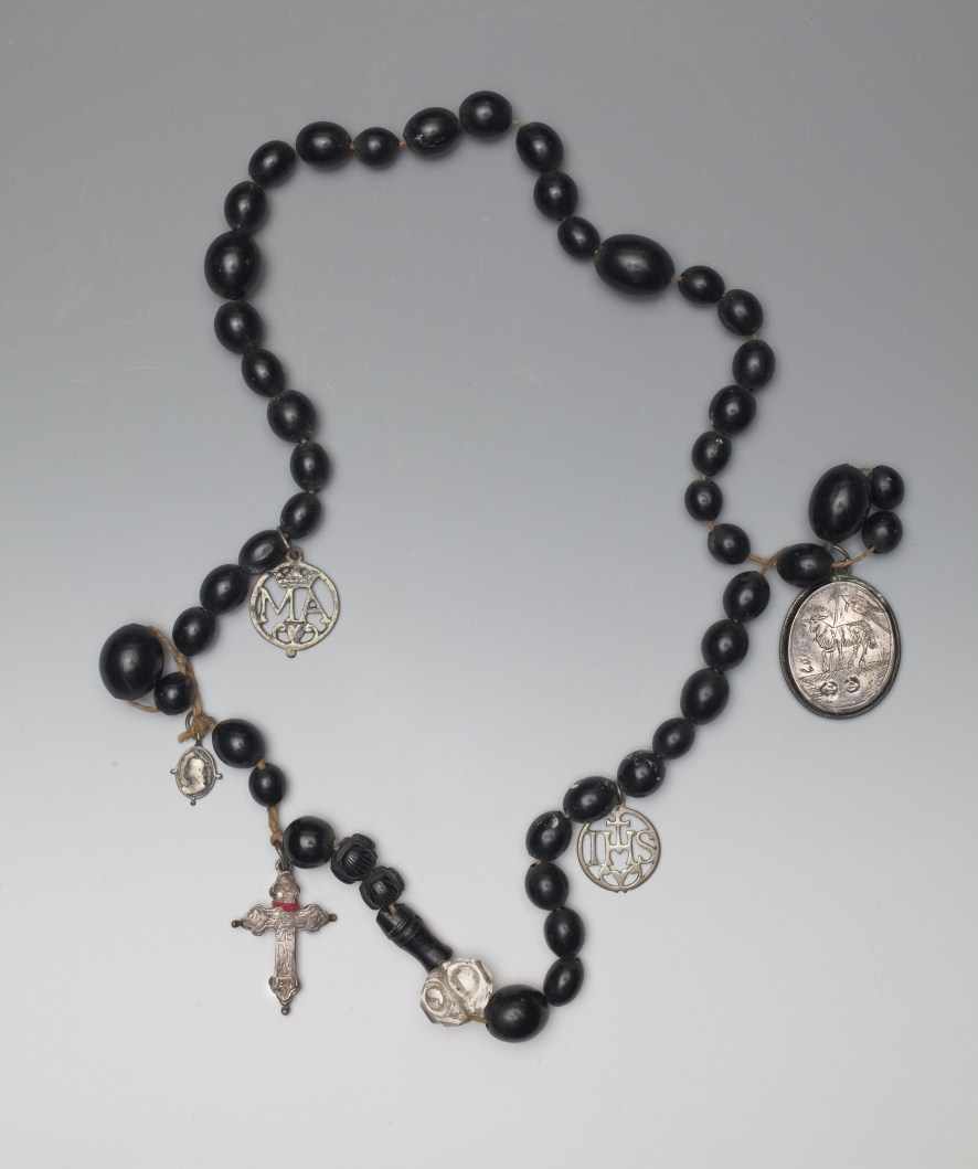 Rozenkrans met zwarte kralen, zilveren kruisje en medailles en medaillon met Agnus Dei