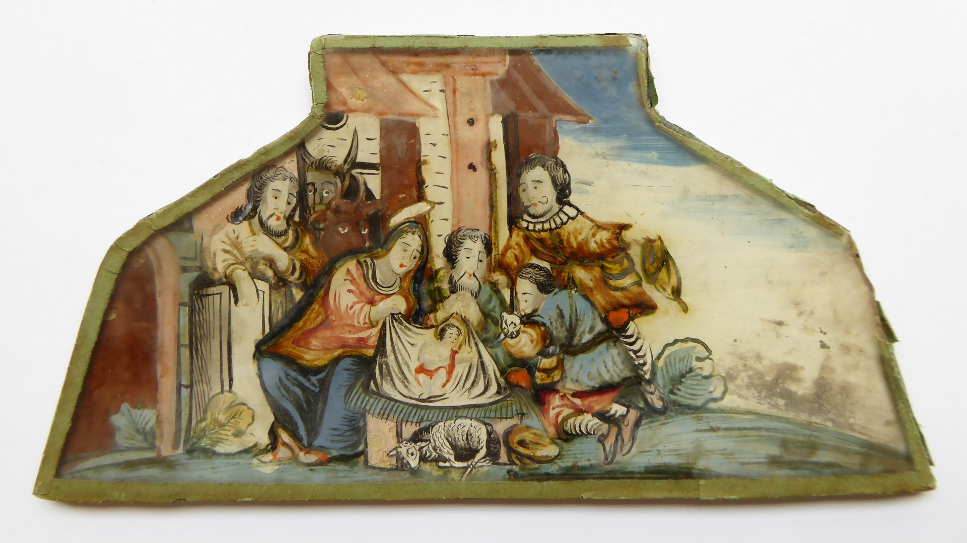 Schildering achter glas met geboorte van Christus, aanbidding door herders