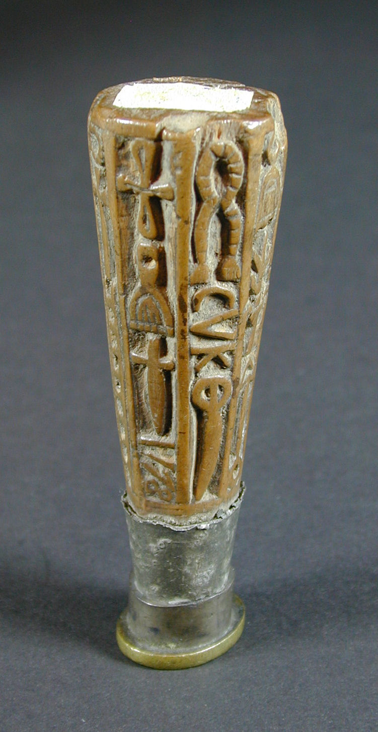 Zegelstempel met naamcijfer en houten handvat waarin gesneden de passie-instrumenten