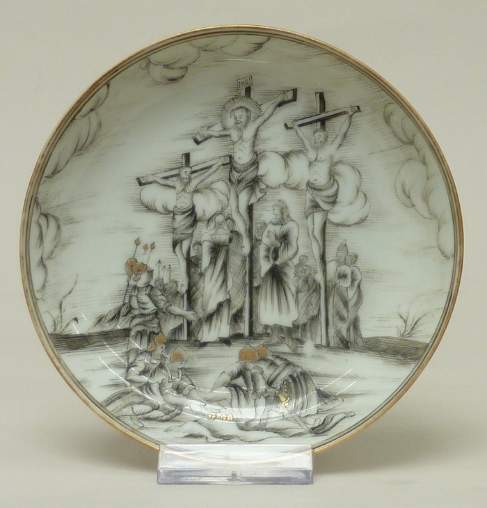 Servies, 36-delig, waarop voorstelling van calvarie, schotel