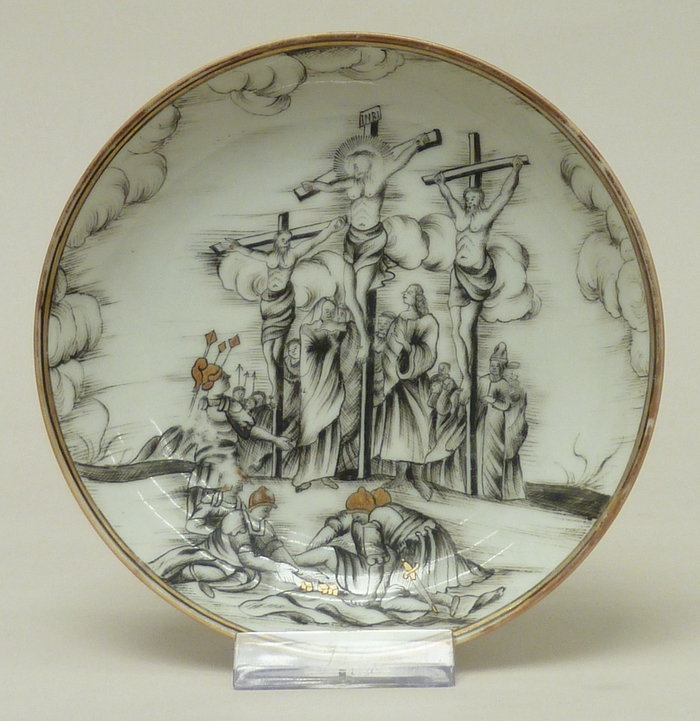 Servies, 36-delig, waarop voorstelling van calvarie, schotel