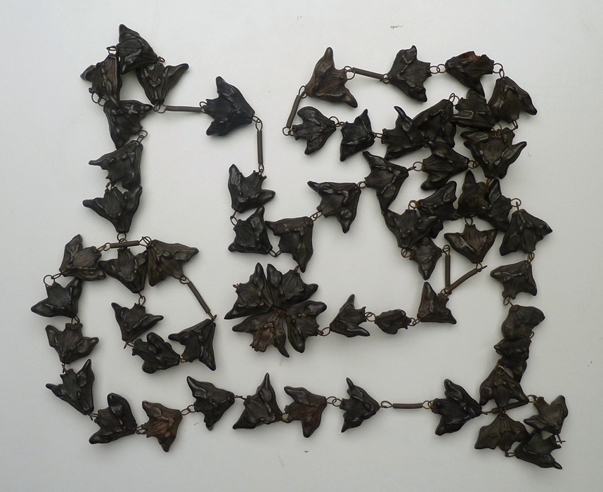 Rozenkrans van zwarte gedroogde waternoten (waterkastanjes) verbonden door metalen schakels