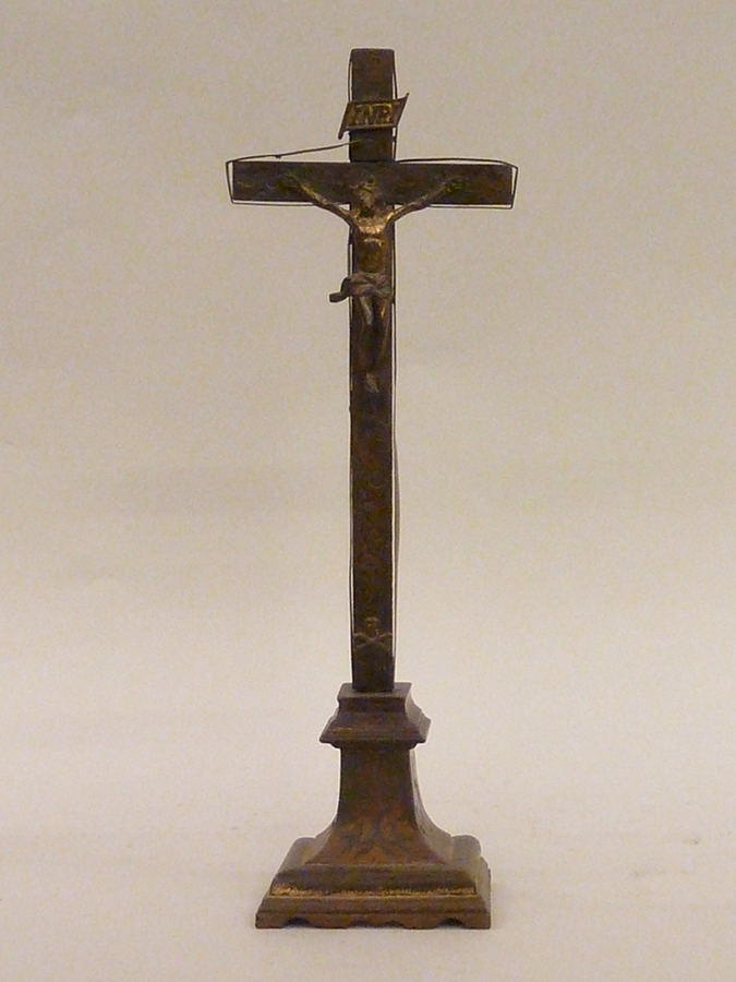 Houten kruis met metalen corpus, met sporen van verguldsel, kruisbalken met koperen strip