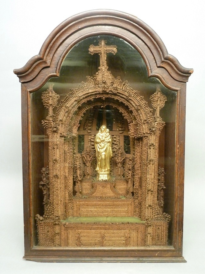Kastje met gebogen kuif waarin huisaltaar met filigraanwerk en Mariabeeldje