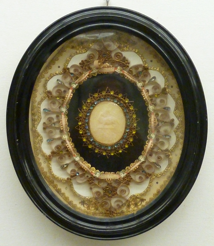 Zwart houten lijst waarin Agnus Dei en enige relieken