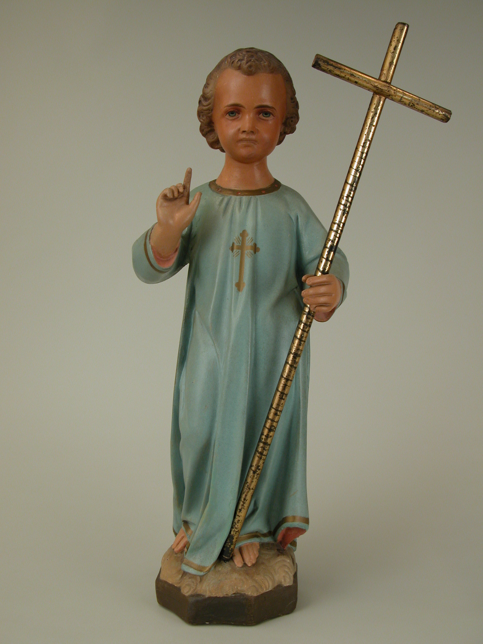 Christuskind in blauw gewaad met los, verguld houten kruis