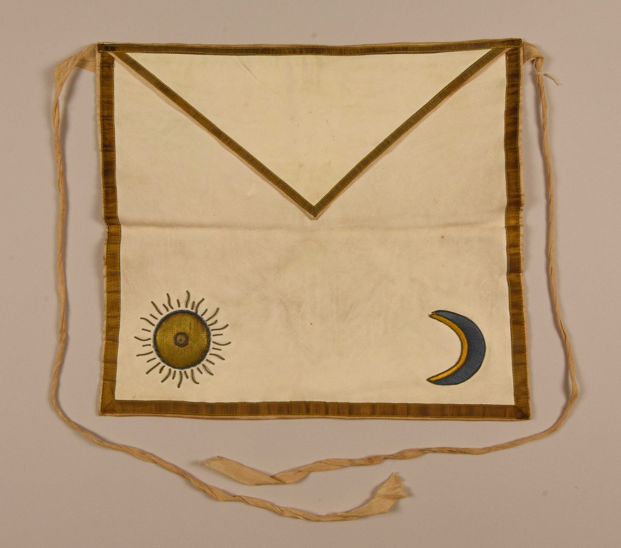 Wit schootsvel geborduurd met maansikkel in geel en blauw en met zon met stralen