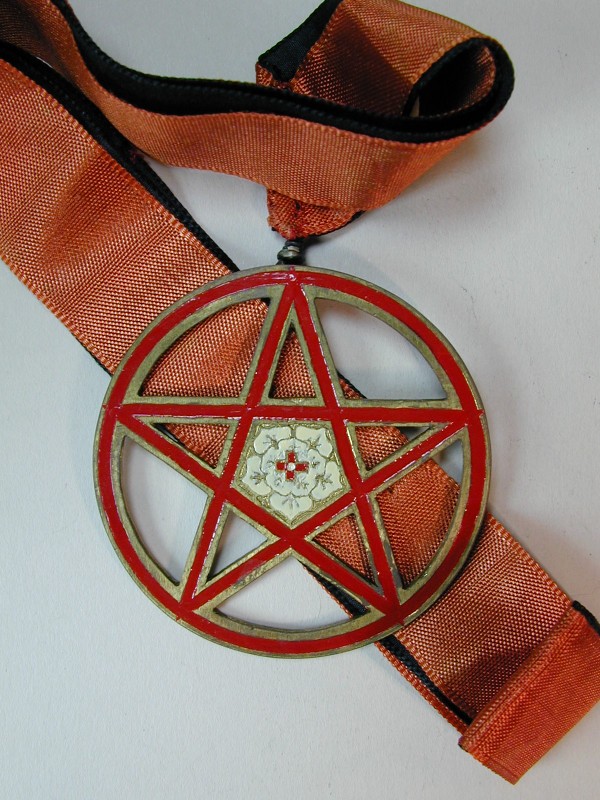 Hanger aan rood lint in vorm van rode vijfpuntige ster gevat in cirkel