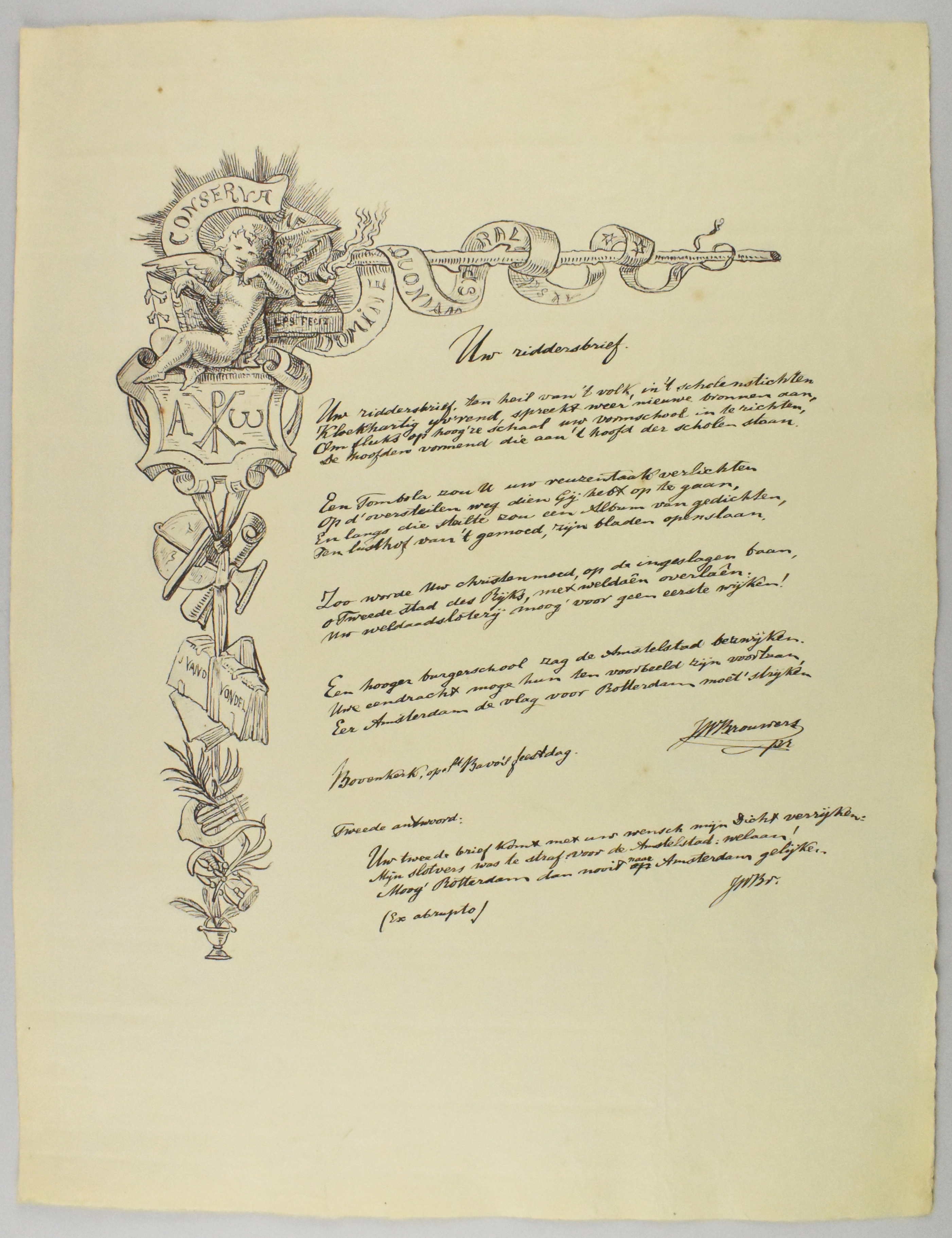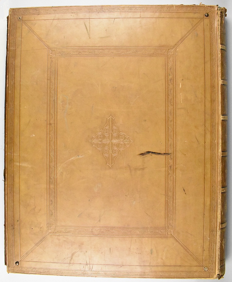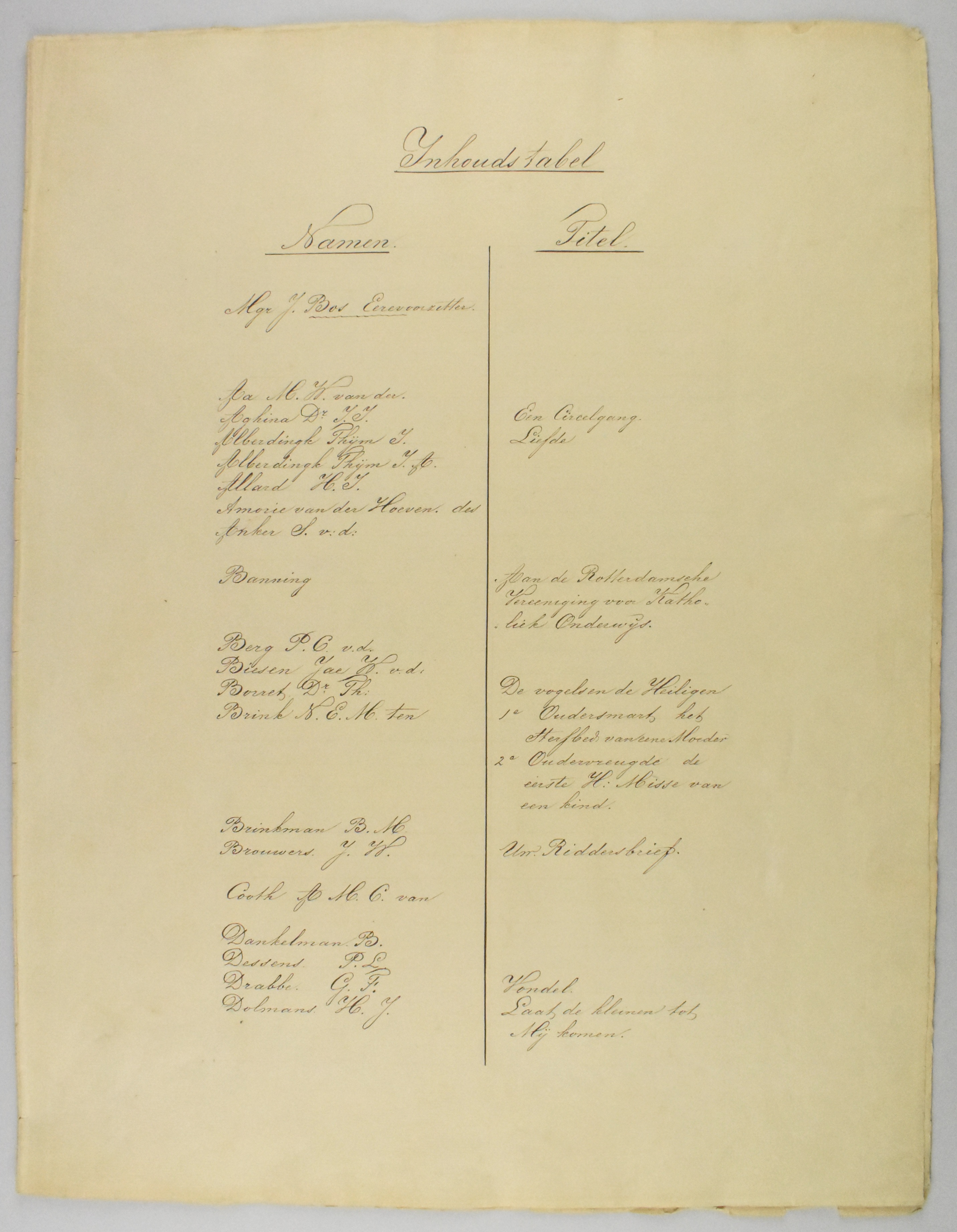Geschenk der voornaamste R.K. schrijvers & dichters van Nederland aan de loterijcommissie van de Rotterdamsche Vereeniging voor Katholiek Onderwijs, bundel met teksten en gedichten van 63 verschillende auteurs, in bruine foedraal