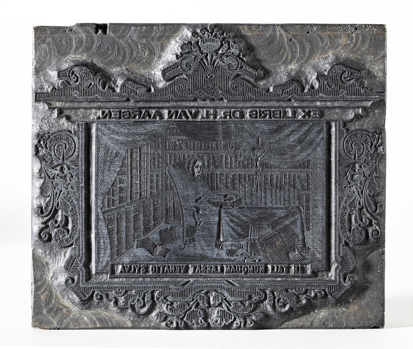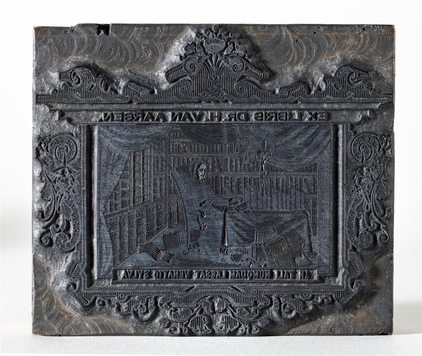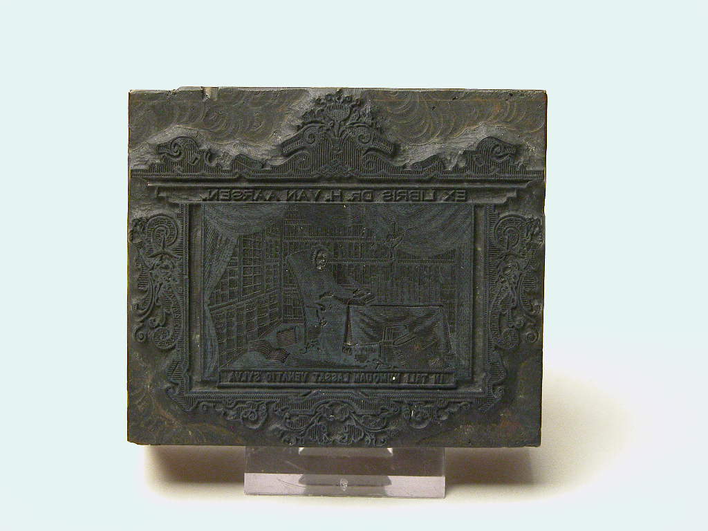 Houtblok van het in houtgravure uitgevoerde ex-libris van Dr. H. van Aarsen