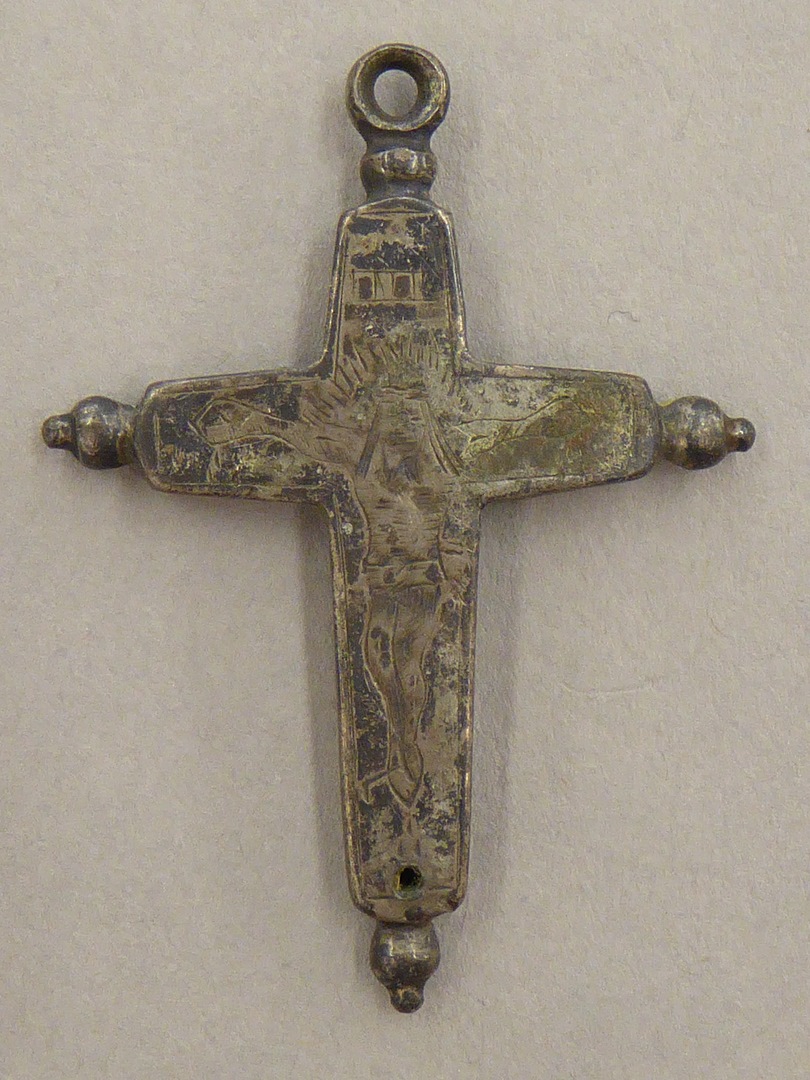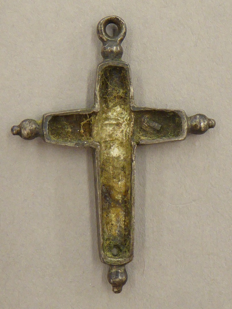 Rozenkranskruisje met afbeelding van Christus met "INRI", achterzijde hol