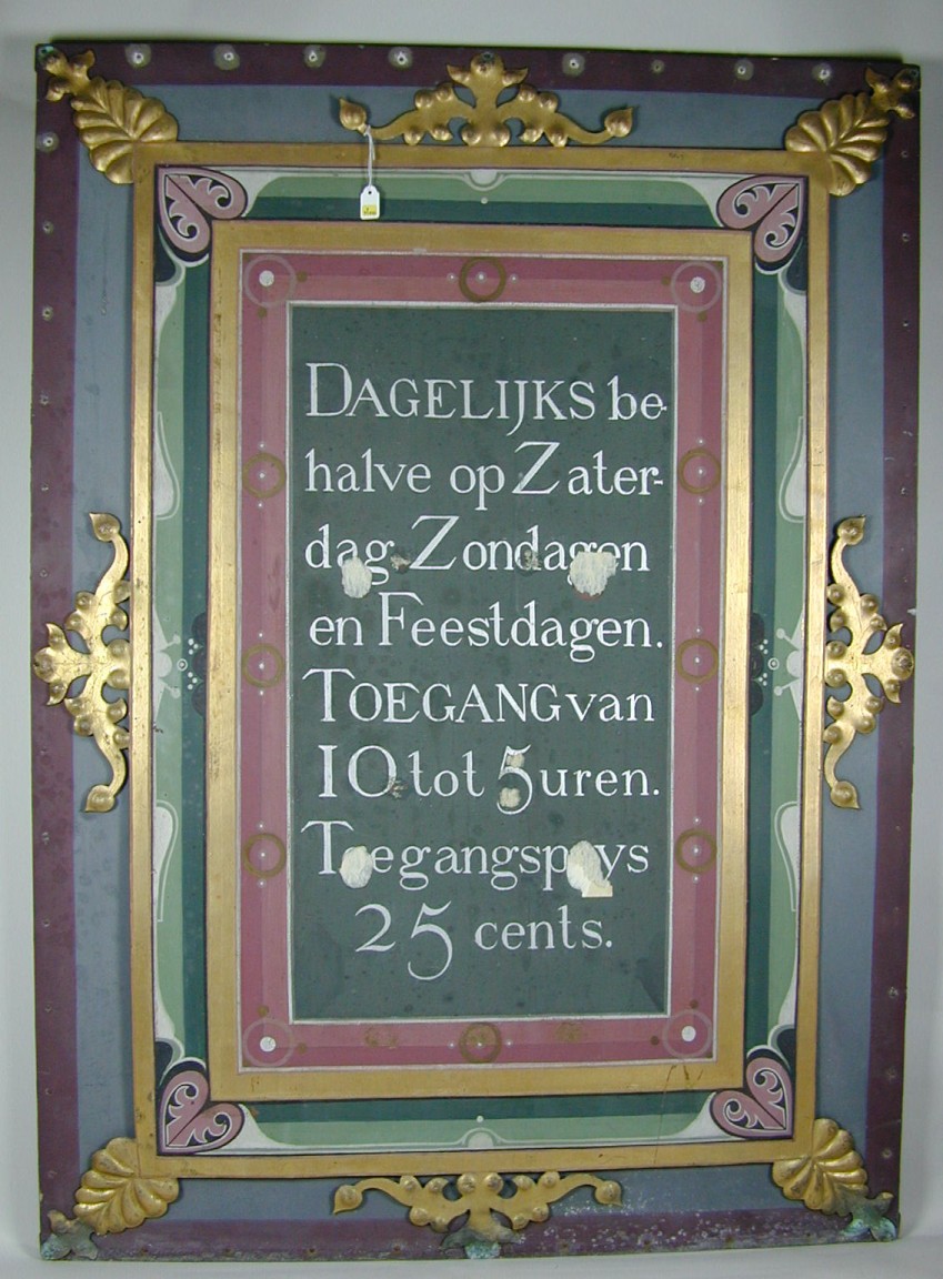 Gevelbord van Bisschoppelijk Museum Haarlem met "Dagelijks behalve op zaterdag, zondagen en feestdagen. Toegang van 10 tot 5 uren. Toegangsprijs 25 cents."