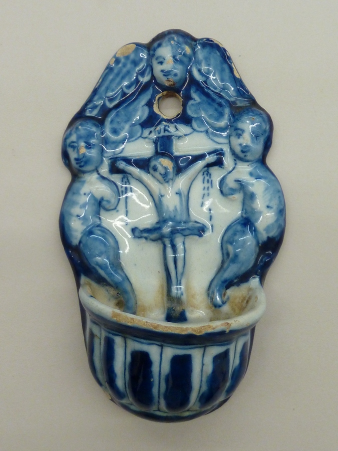 Wijwaterbakje versierd met crucifix geflankeerd door drie engeltjes