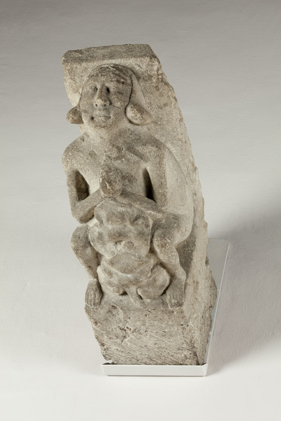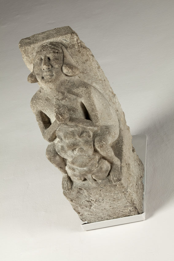 De kraagsteen toont een gehurkte figuur met gevouwen handen. Tussen de benen van de figuur en voor de buik zijn boven elkaar twee koolblad-achtige bladeren aangebracht. De figuur heeft een licht glimlachend, ovaal gelaat met forse, rechte neus en amandelvormige ogen, waarvan de oogleden duidelijk zijn aangegeven. De romp van de figuur is groot en ...
