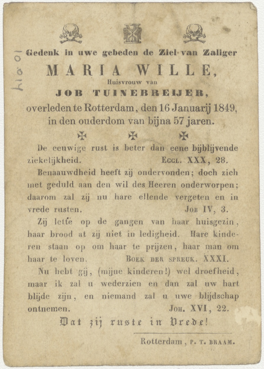 Heilige Maria, kz. Bid voor ziel Wille-Tulnebreyer (+1849) Rotterdam