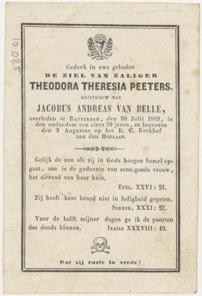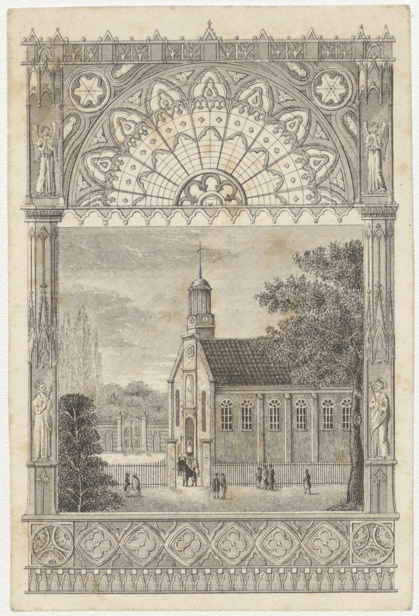 Kerk gevat in gotisch raam, kz. Bid voor ziel Van Belle-Peeters (+1849) Rotterdam