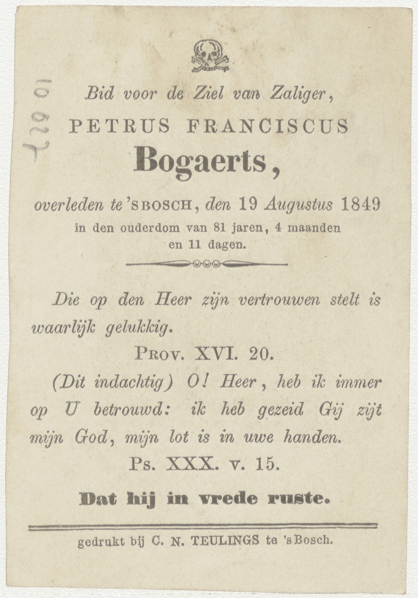 Onwrikbare wet, geboden van God, kz. Bid voor ziel Bogaerts (+1849) Den Bosch