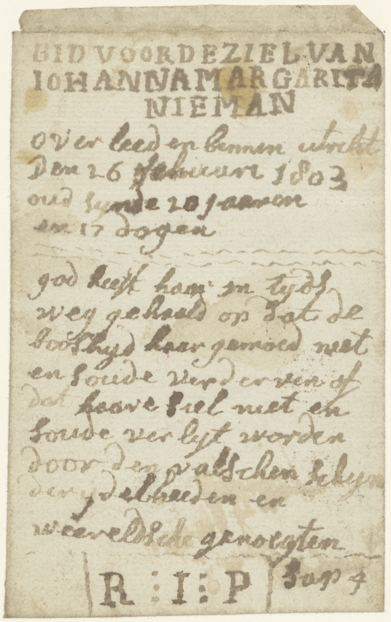 Handschrift, omslag voor kantprent, kz. Bid voor ziel Johanna Margarita Nieman (+1803), Utrecht
