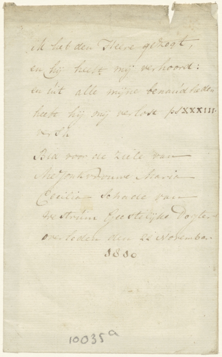 Envelop voor bidprent OKM dp10035, met "... bid de voor ziele van mejonkvrouwe Maria Cecilia Schade van Westrum, geestelijken dogter overleden den 22 november 1810"