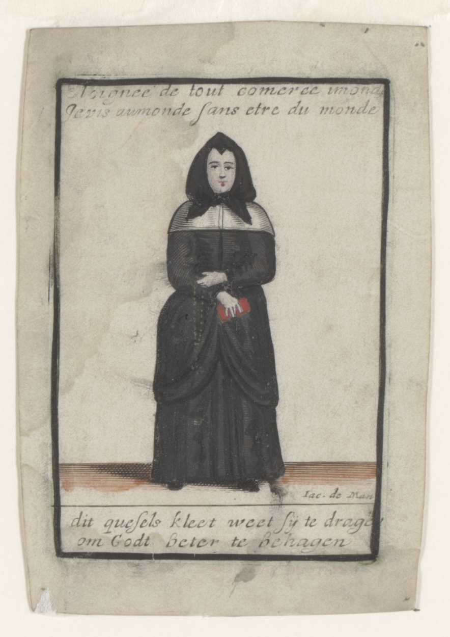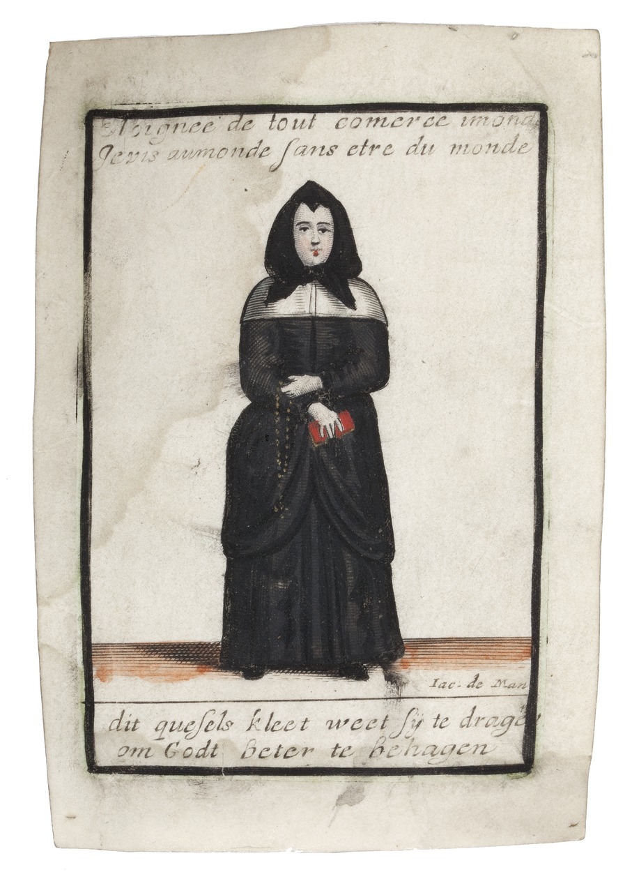 Religieuze orde: klop, ingekleurd Boven de prent Franse tekst. Onder de prent de tekst: Dit quesels kleet weet gij te dragen om Godt beter te behagen.