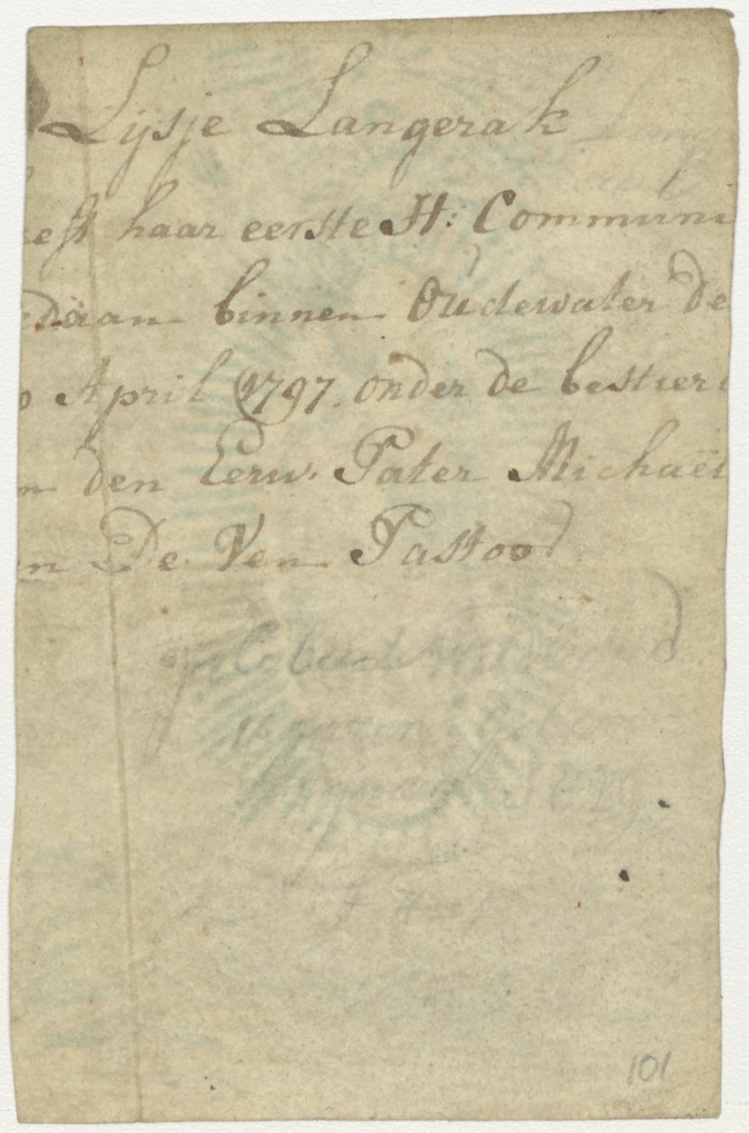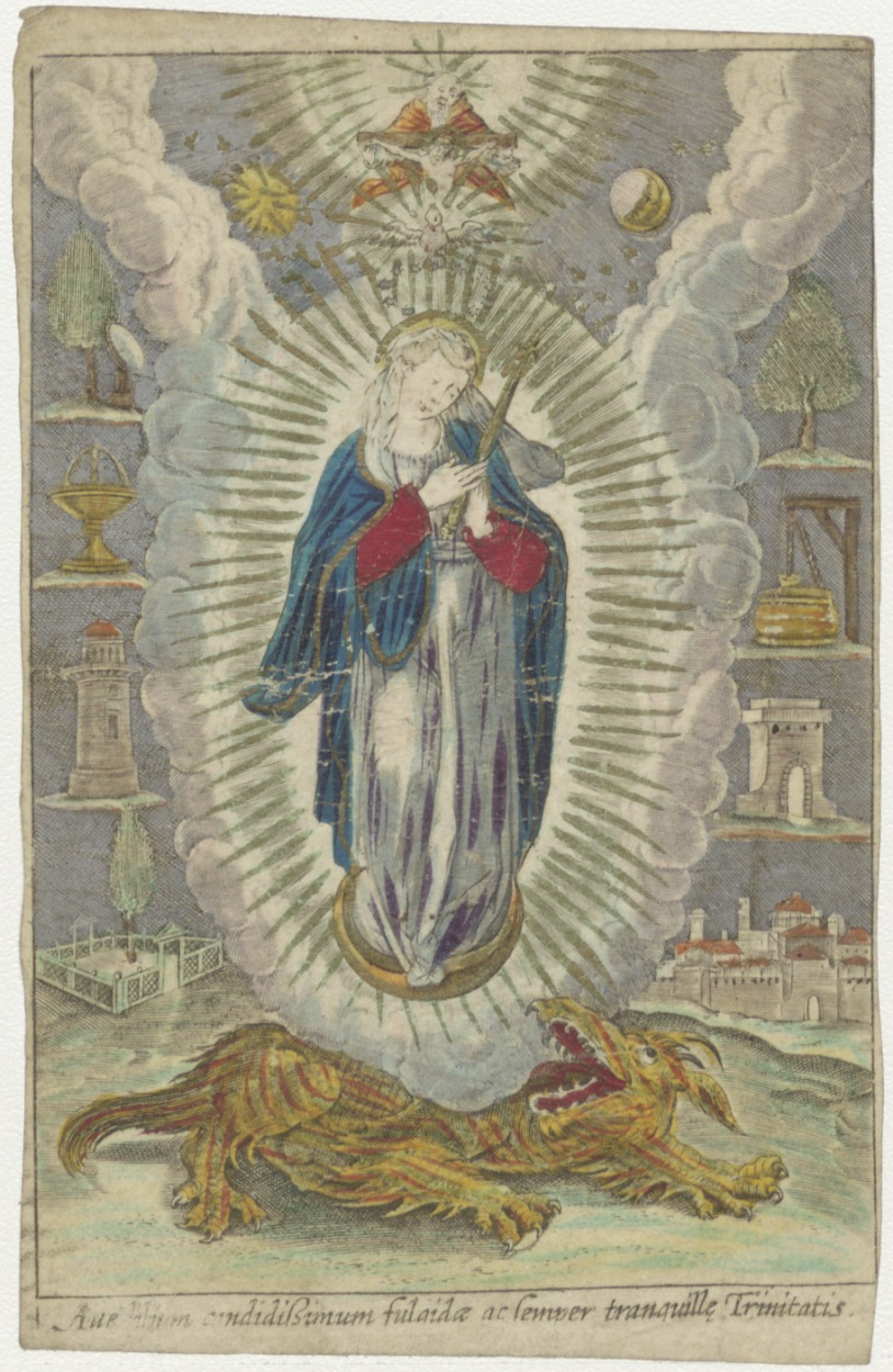 Maria met in het klein, vader, zoon en H. Geest zwevend op draak, ingekleurd, kz. H. Communie Lijsje Langerak;1797;Oudewater;door pastoor Van de Ven;
