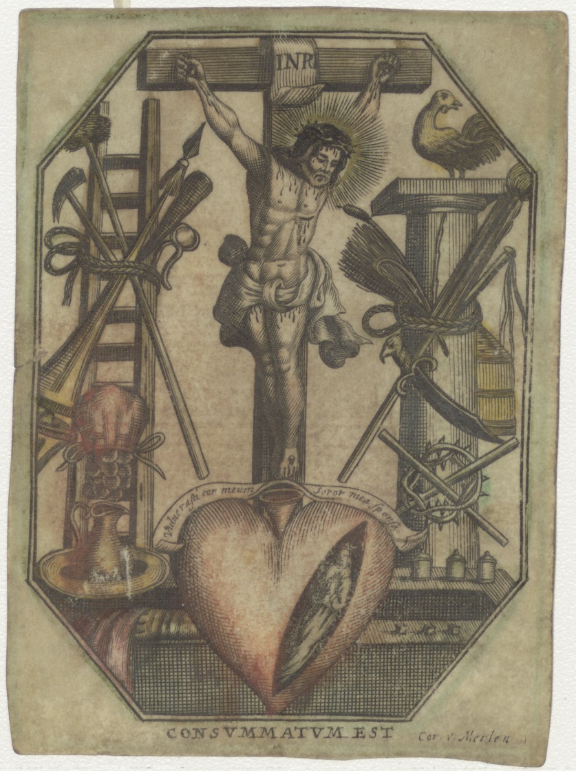 H. Hart van Christus met passiewerktuigen en kruis, ingekleurd, kz. 1761(?);tekst(?);