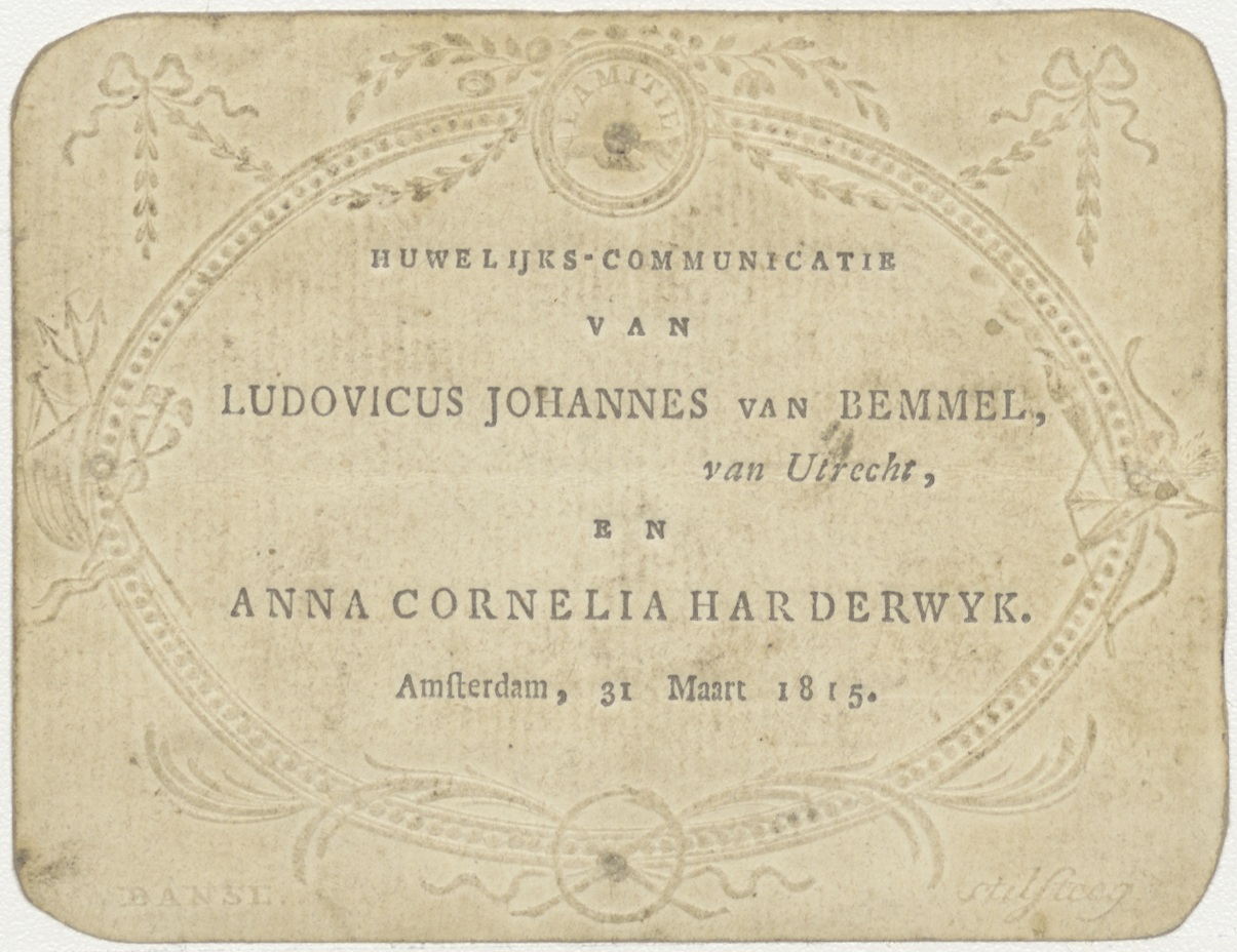 Huwelijkscommunicatie van Van Bemmel-Harderwijk, Amsterdam, Utrecht 1815